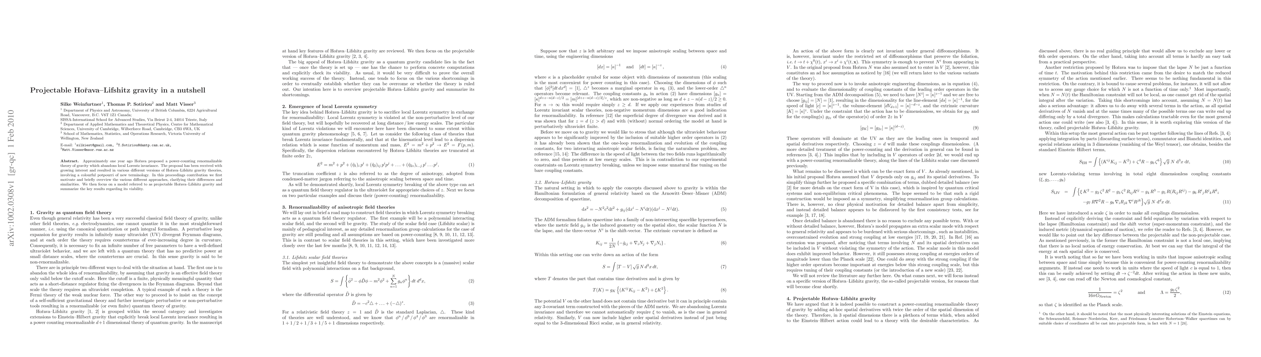 The paper presents a comprehensive analysis of the projectable Hořava-Lifshitz gravity, deriving its action, discussing its symmetries, and analyzing its excitations, including the problematic scalar mode.