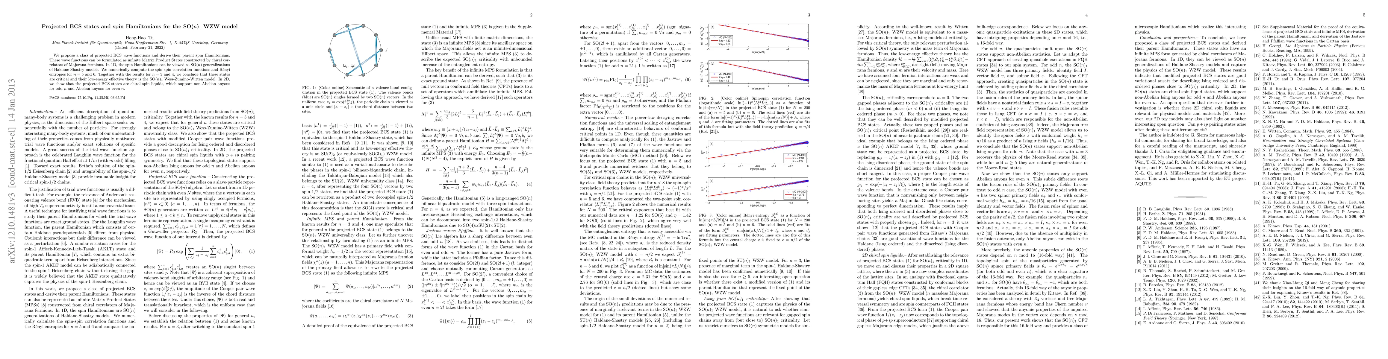 We propose a class of projected BCS wave functions and derive their parent spin Hamiltonians. These wave functions can be formulated as infinite Matrix Product States constructed by chiral correlators of Majorana fermions. In 1D, the spin Hamiltonians can be viewed as SO(n) generalizations of Haldane-Shastry models. We numerically compute the spin-spin correlation functions and Renyi entropies for n=5 and 6. Together with the results for n=3 and 4, we conclude that these states are critical and their low-energy effective theory is the SO(n)_1 Wess-Zumino-Witten model. In 2D, we show that the projected BCS states are chiral spin liquids, which support non-Abelian anyons for odd n and Abelian anyons for even n.