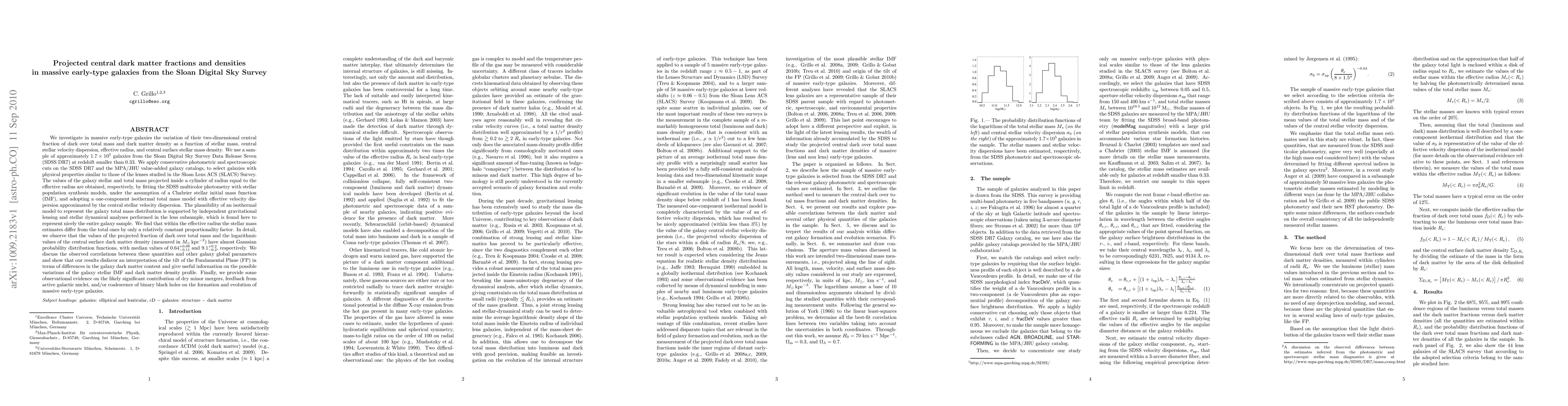 We investigate in massive early-type galaxies the variation of their two-dimensional central fraction of dark over total mass and dark matter density as a function of stellar mass, central stellar velocity dispersion, effective radius, and central surface stellar mass density. We use a sample of ~ 1.7 x 10^5 galaxies from the SDSS DR7 at redshift smaller than 0.33. We apply conservative photometric and spectroscopic cuts to select galaxies with physical properties similar to those of the lenses studied in the SLACS Survey. The values of the galaxy stellar and total mass projected inside a cylinder of radius equal to the effective radius are obtained, respectively, by fitting the SDSS multicolor photometry with stellar population synthesis models, under the assumption of a Chabrier stellar IMF, and adopting a one-component isothermal total mass model with effective velocity dispersion approximated by the central stellar velocity dispersion. We find that within the effective radius the stellar mass estimates differ from the total ones by only a relatively constant proportionality factor. In detail, we observe that the values of the projected fraction of dark over total mass and the logarithmic values of the central surface dark matter density (measured in M_{Sun} kpc^{-2}) have almost Gaussian probability distribution functions, with median values of 0.64^{+0.08}_{-0.11} and 9.1^{+0.2}_{-0.2}, respectively. Our results disfavor an interpretation of the tilt of the FP in terms of differences in the galaxy dark matter content and give useful information on the possible variations of the galaxy stellar IMF and dark matter density profile. Finally, we provide some observational evidence on the likely significant contribution of dry minor mergers, feedback from active galactic nuclei, and/or coalescence of binary black holes on the formation and evolution of massive early-type galaxies.