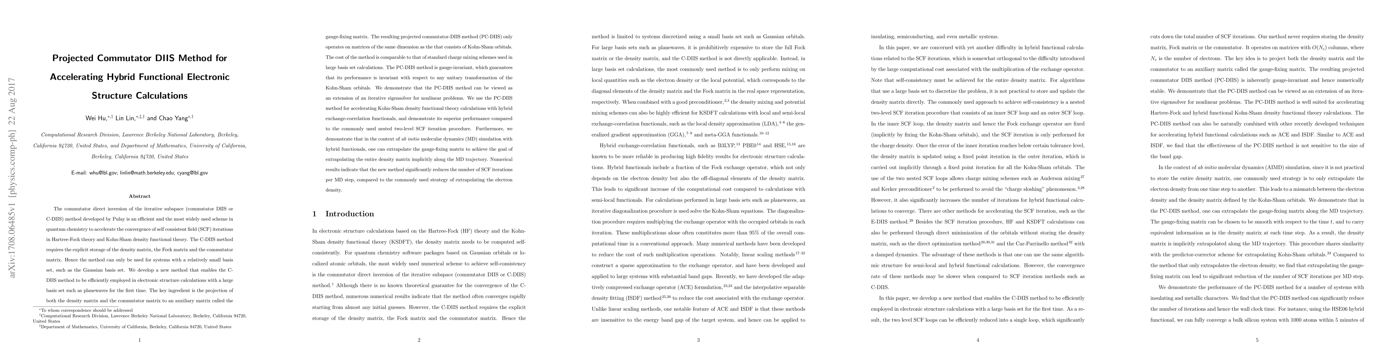The commutator direct inversion of the iterative subspace (commutator DIIS or C-DIIS) method developed by Pulay is an efficient and the most widely used scheme in quantum chemistry to accelerate the convergence of self consistent field (SCF) iterations in Hartree-Fock theory and Kohn-Sham density functional theory. The C-DIIS method requires the explicit storage of the density matrix, the Fock matrix and the commutator matrix. Hence the method can only be used for systems with a relatively small basis set, such as the Gaussian basis set. We develop a new method that enables the C-DIIS method to be efficiently employed in electronic structure calculations with a large basis set such as planewaves for the first time. The key ingredient is the projection of both the density matrix and the commutator matrix to an auxiliary matrix called the gauge-fixing matrix. The resulting projected commutator-DIIS method (PC-DIIS) only operates on matrices of the same dimension as the that consists of Kohn-Sham orbitals. The cost of the method is comparable to that of standard charge mixing schemes used in large basis set calculations. The PC-DIIS method is gauge-invariant, which guarantees that its performance is invariant with respect to any unitary transformation of the Kohn-Sham orbitals. We demonstrate that the PC-DIIS method can be viewed as an extension of an iterative eigensolver for nonlinear problems. We use the PC-DIIS method for accelerating Kohn-Sham density functional theory calculations with hybrid exchange-correlation functionals, and demonstrate its superior performance compared to the commonly used nested two-level SCF iteration procedure.