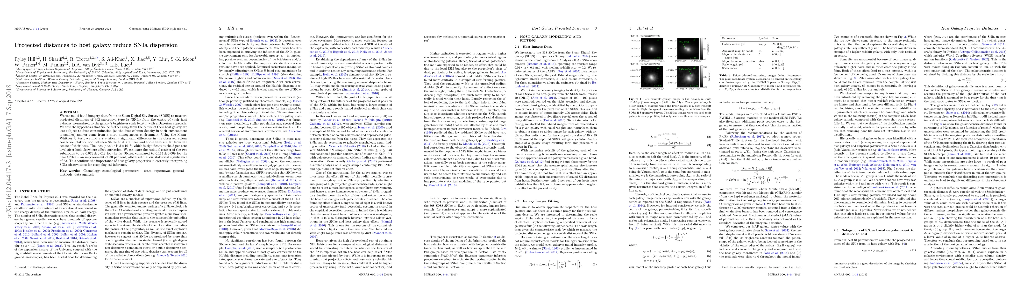 We use multi-band imagery data from the Sloan Digital Sky Survey (SDSS) to measure projected distances of 302 supernova type Ia (SNIa) from the centre of their host galaxies, normalized to the galaxy's brightness scale length, with a Bayesian approach. We test the hypothesis that SNIas further away from the centre of their host galaxy are less subject to dust contamination (as the dust column density in their environment is smaller) and/or come from a more homogeneous environment. Using the Mann-Whitney U test, we find a statistically significant difference in the observed colour correction distribution between SNIas that are near and those that are far from the centre of their host. The local p-value is 3 x 10^{-3}, which is significant at the 5 per cent level after look-elsewhere effect correction. We estimate the residual scatter of the two subgroups to be 0.073 +/- 0.018 for the far SNIas, compared to 0.114 +/- 0.009 for the near SNIas -- an improvement of 30 per cent, albeit with a low statistical significance of 2sigma. This confirms the importance of host galaxy properties in correctly interpreting SNIa observations for cosmological inference.