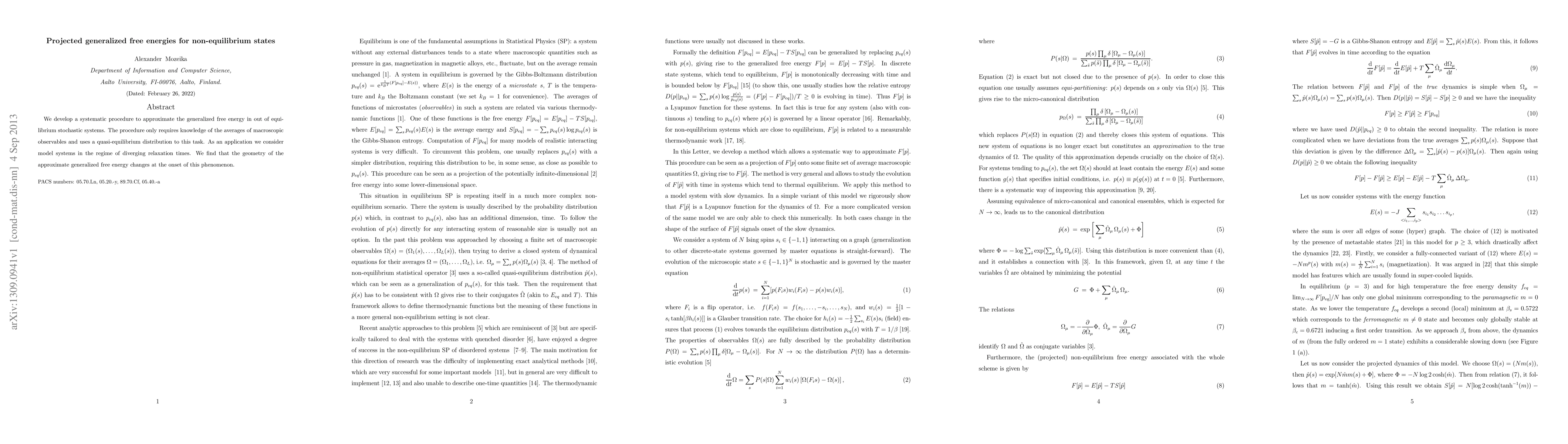 We develop a systematic procedure to approximate generalized free energy in out of equilibrium stochastic systems. The procedure only requires knowledge of the averages of macroscopic observables and uses quasi-equilibrium distribution to this task. As an application we consider model systems in the regime of diverging relaxation times. We find that geometry of the approximate generalized free energy changes at the onset of this phenomena.