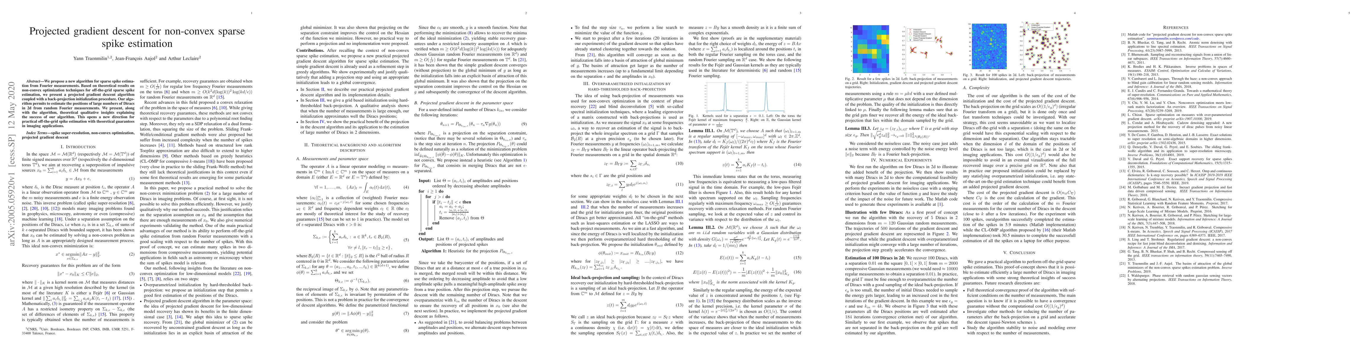 We propose a new algorithm for sparse spike estimation from Fourier measurements. Based on theoretical results on non-convex optimization techniques for off-the-grid sparse spike estimation, we present a projected gradient descent algorithm coupled with a spectral initialization procedure. Our algorithm permits to estimate the positions of large numbers of Diracs in 2d from random Fourier measurements. We present, along with the algorithm, theoretical qualitative insights explaining the success of our algorithm. This opens a new direction for practical off-the-grid spike estimation with theoretical guarantees in imaging applications.