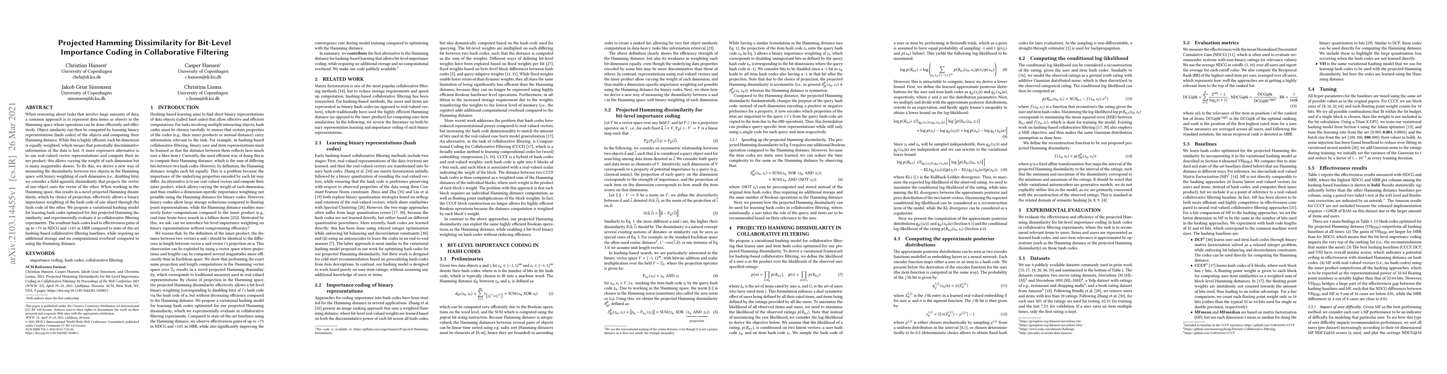 When reasoning about tasks that involve large amounts of data, a common approach is to represent data items as objects in the Hamming space where operations can be done efficiently and effectively. Object similarity can then be computed by learning binary representations (hash codes) of the objects and computing their Hamming distance. While this is highly efficient, each bit dimension is equally weighted, which means that potentially discriminative information of the data is lost. A more expressive alternative is to use real-valued vector representations and compute their inner product; this allows varying the weight of each dimension but is many magnitudes slower. To fix this, we derive a new way of measuring the dissimilarity between two objects in the Hamming space with binary weighting of each dimension (i.e., disabling bits): we consider a field-agnostic dissimilarity that projects the vector of one object onto the vector of the other. When working in the Hamming space, this results in a novel projected Hamming dissimilarity, which by choice of projection, effectively allows a binary importance weighting of the hash code of one object through the hash code of the other. We propose a variational hashing model for learning hash codes optimized for this projected Hamming dissimilarity, and experimentally evaluate it in collaborative filtering experiments. The resultant hash codes lead to effectiveness gains of up to +7% in NDCG and +14% in MRR compared to state-of-the-art hashing-based collaborative filtering baselines, while requiring no additional storage and no computational overhead compared to using the Hamming distance.