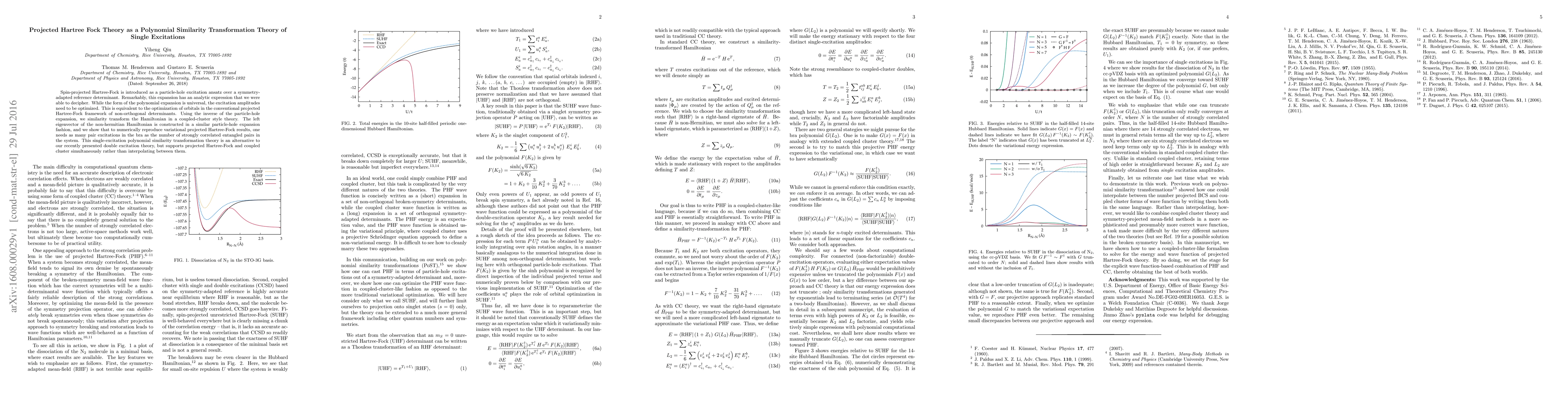 Spin-projected Hartree-Fock is introduced as a particle-hole excitation ansatz over a symmetry-adapted reference determinant. Remarkably, this expansion has an analytic expression that we were able to decipher. While the form of the polynomial expansion is universal, the excitation amplitudes need to be optimized. This is equivalent to the optimization of orbitals in the conventional projected Hartree-Fock framework of non-orthogonal determinants. Using the inverse of the particle-hole expansion, we similarity transform the Hamiltonian in a coupled-cluster style theory. The left eigenvector of the non-hermitian Hamiltonian is constructed in a similar particle-hole expansion fashion, and we show that to numerically reproduce variational projected Hartree-Fock results, one needs as many pair excitations in the bra as the number of strongly correlated entangled pairs in the system. This single-excitation polynomial similarity transformation theory is an alternative to our recently presented double excitation theory, but supports projected Hartree-Fock and coupled cluster simultaneously rather than interpolating between them.