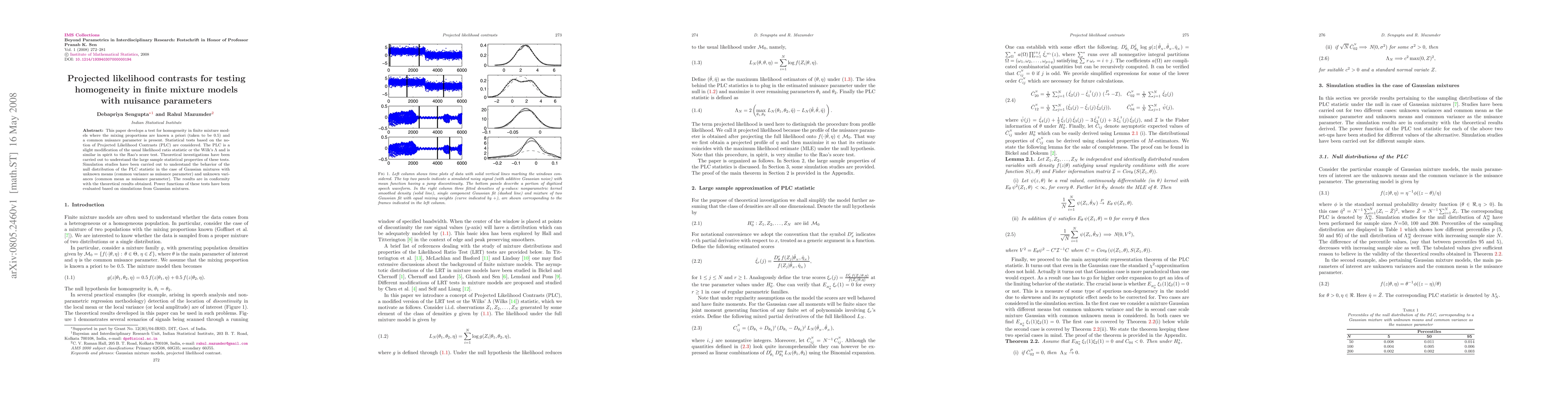 This paper develops a test for homogeneity in finite mixture models with nuisance parameters, using Projected Likelihood Contrasts (PLC), which are similar to likelihood ratio statistics or Rao's score test, and investigates their statistical properties through simulations and theoretical investigations.