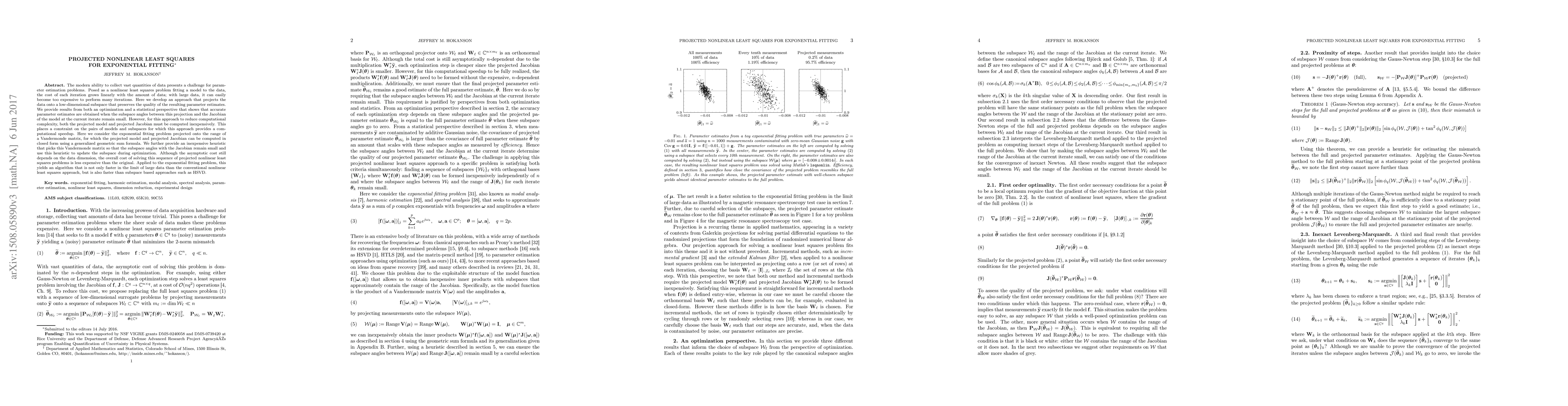 The modern ability to collect vast quantities of data poses a challenge for parameter estimation problems. When posed as a nonlinear least squares problem fitting a model to data, the cost of each iteration grows linearly with the amount of data and it can easily become prohibitively expensive to perform many iterations. Here we develop an approach that projects the data onto a low-dimensional subspace of the high-dimensional data that preserves the information in the original data. We provide results from both optimization and statistical perspectives showing that the information is preserved when the subspace angles between this projection and the Jacobian of the model at the current iterate remain small. However, for this approach to reduce computational complexity, both the projected model and Jacobian must be computed inexpensively. This is a constraint on the pairs of models and subspaces for which this approach provides a computational speedup. Here we consider the exponential fitting problem projected onto the range of Vandermonde matrix, for which the projected model and Jacobian can be computed in closed form using a generalized geometric sum formula. We further provide an inexpensive heuristic that picks this Vandermonde matrix so that the subspace angles with the Jacobian remain small and use this heuristic to update the subspace during optimization. Although the asymptotic cost still depends on the data dimension, the overall cost of this sequence of projected nonlinear least squares problems is less expensive than the original nonlinear least squares problem. Applied to the exponential fitting problem, this provides an algorithm that is not only faster in the limit of large data than the conventional nonlinear least squares approach, but is also faster than subspace based approaches such as HSVD.