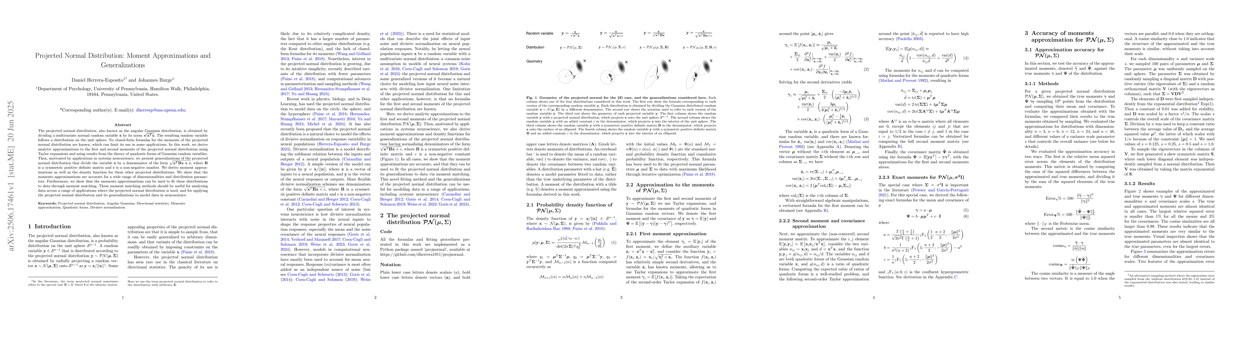 The projected normal distribution, also known as the angular Gaussian distribution, is obtained by dividing a multivariate normal random variable $\mathbf{x}$ by its norm $\sqrt{\mathbf{x}^T \mathbf{x}}$. The resulting random variable follows a distribution on the unit sphere. No closed-form formulas for the moments of the projected normal distribution are known, which can limit its use in some applications. In this work, we derive analytic approximations to the first and second moments of the projected normal distribution using Taylor expansions and using results from the theory of quadratic forms of Gaussian random variables. Then, motivated by applications in systems neuroscience, we present generalizations of the projected normal distribution that divide the variable $\mathbf{x}$ by a denominator of the form $\sqrt{\mathbf{x}^T \mathbf{B} \mathbf{x} + c}$, where $\mathbf{B}$ is a symmetric positive definite matrix and $c$ is a non-negative number. We derive moment approximations as well as the density function for these other projected distributions. We show that the moments approximations are accurate for a wide range of dimensionalities and distribution parameters. Furthermore, we show that the moments approximations can be used to fit these distributions to data through moment matching. These moment matching methods should be useful for analyzing data across a range of applications where the projected normal distribution is used, and for applying the projected normal distribution and its generalizations to model data in neuroscience.
