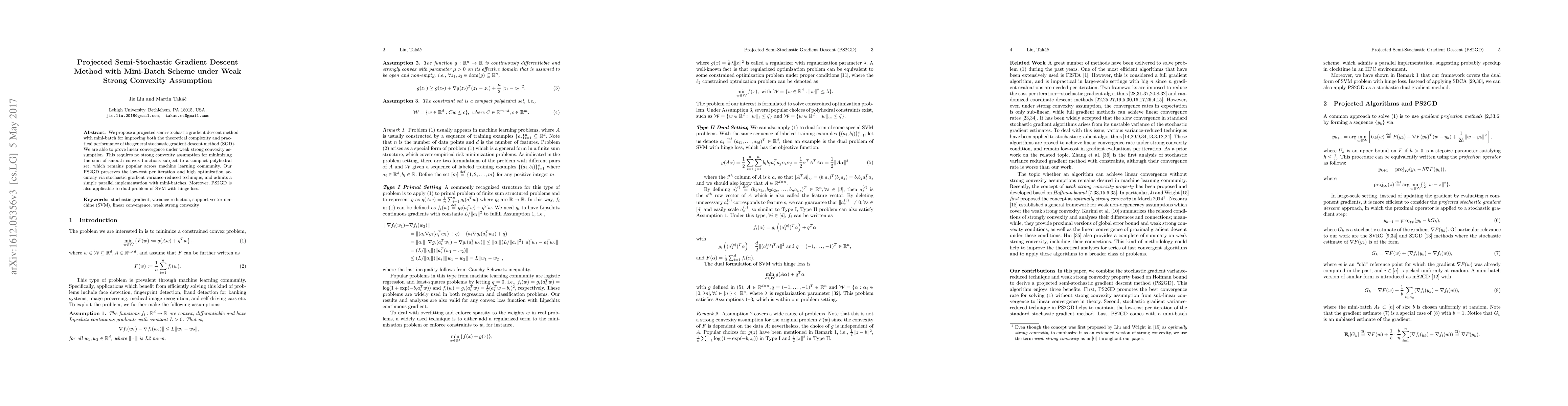 We propose a projected semi-stochastic gradient descent method with mini-batch for improving both the theoretical complexity and practical performance of the general stochastic gradient descent method (SGD). We are able to prove linear convergence under weak strong convexity assumption. This requires no strong convexity assumption for minimizing the sum of smooth convex functions subject to a compact polyhedral set, which remains popular across machine learning community. Our PS2GD preserves the low-cost per iteration and high optimization accuracy via stochastic gradient variance-reduced technique, and admits a simple parallel implementation with mini-batches. Moreover, PS2GD is also applicable to dual problem of SVM with hinge loss.