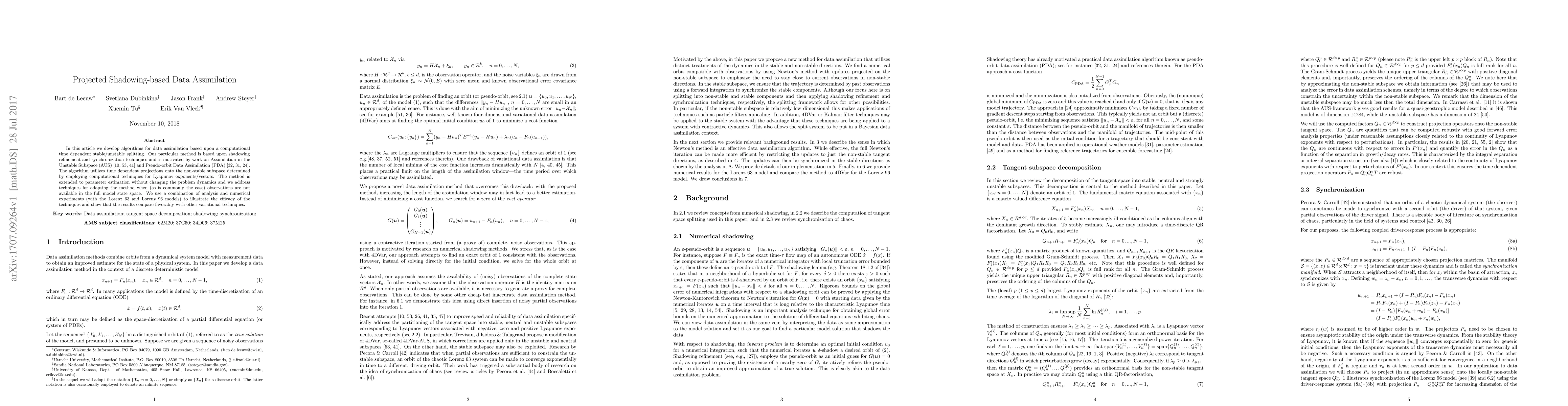 The paper introduces a new class of data assimilation algorithms based on shadowing refinement, synchronization, AUS, and PDA techniques, utilizing projections onto stable and non-stable subspaces determined by Lyapunov exponents/vectors.