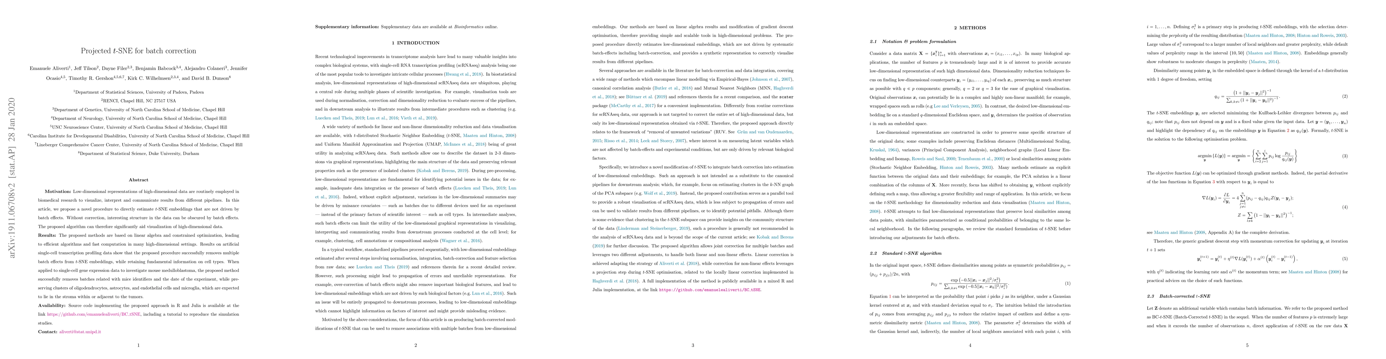 Biomedical research often produces high-dimensional data confounded by batch effects such as systematic experimental variations, different protocols and subject identifiers. Without proper correction, low-dimensional representation of high-dimensional data might encode and reproduce the same systematic variations observed in the original data, and compromise the interpretation of the results. In this article, we propose a novel procedure to remove batch effects from low-dimensional embeddings obtained with t-SNE dimensionality reduction. The proposed methods are based on linear algebra and constrained optimization, leading to efficient algorithms and fast computation in many high-dimensional settings. Results on artificial single-cell transcription profiling data show that the proposed procedure successfully removes multiple batch effects from t-SNE embeddings, while retaining fundamental information on cell types. When applied to single-cell gene expression data to investigate mouse medulloblastoma, the proposed method successfully removes batches related with mice identifiers and the date of the experiment, while preserving clusters of oligodendrocytes, astrocytes, and endothelial cells and microglia, which are expected to lie in the stroma within or adjacent to the tumors.