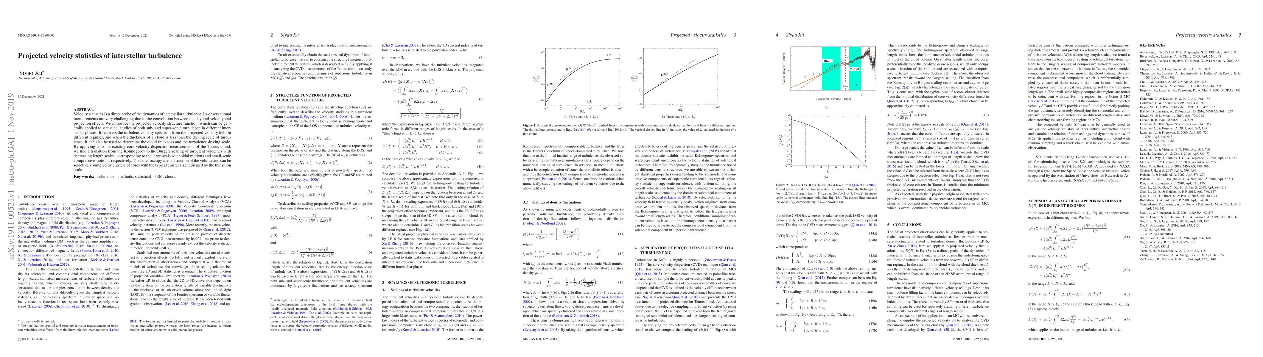 This paper introduces a projected velocity structure function to analyze interstellar turbulence dynamics, revealing a transition from Kolmogorov to Burgers scaling in turbulent velocity statistics in the Taurus cloud, indicating different motion regimes at various scales.