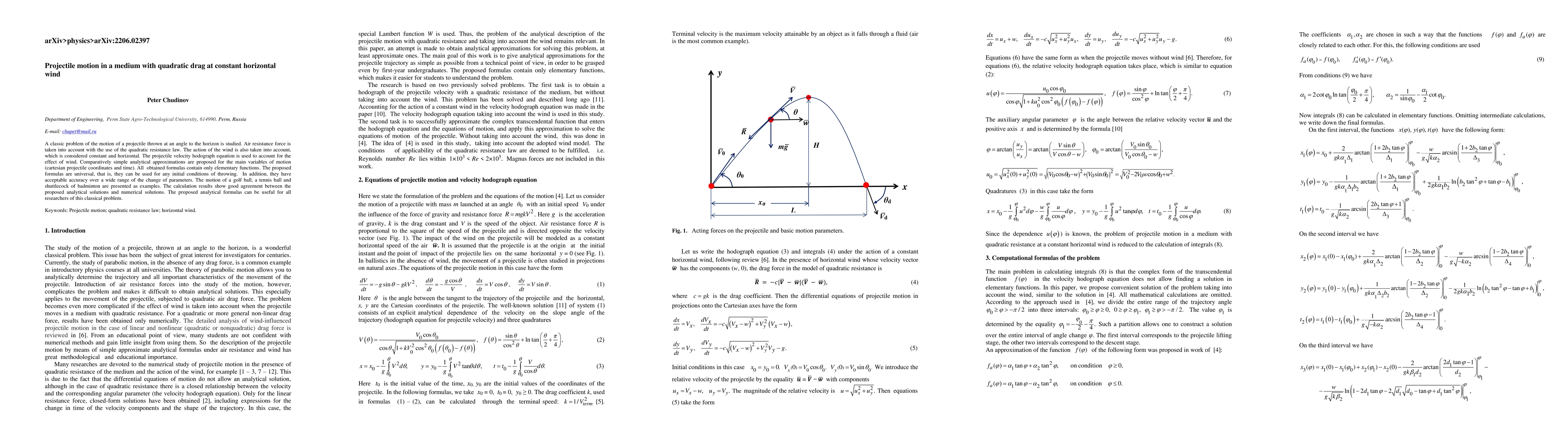 A classic problem of the motion of a projectile thrown at an angle to the horizon is studied. Air resistance force is taken into account with the use of the quadratic resistance law. The action of the wind is also taken into account, which is considered constant and horizontal. The projectile velocity hodograph equation is used to account for the effect of wind. Comparatively simple analytical approximations are proposed for the main variables of motion (cartesian projectile coordinates and time). All obtained formulas contain only elementary functions. The proposed formulas are universal, that is, they can be used for any initial conditions of throwing. In addition, they have acceptable accuracy over a wide range of the change of parameters. The motion of a golf ball, a tennis ball and shuttlecock of badminton are presented as examples. The calculation results show good agreement between the proposed analytical solutions and numerical solutions. The proposed analytical formulas can be useful for all researchers of this classical problem.
