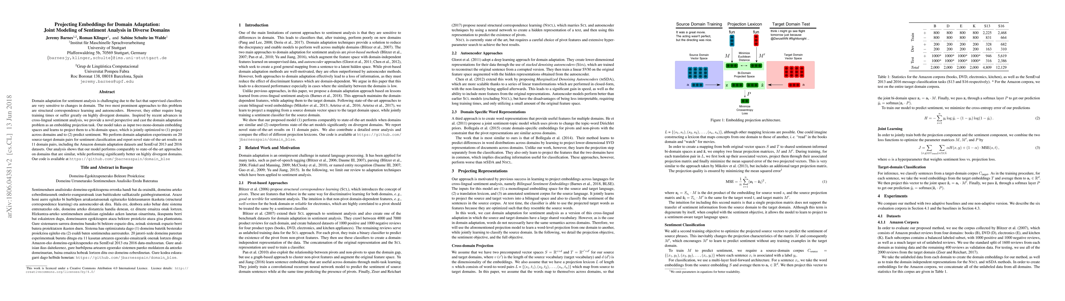 A new model improves sentiment analysis on diverse domains by projecting embeddings from two mono-domain spaces to a bi-domain space, achieving state-of-the-art results on 11 domain pairs.