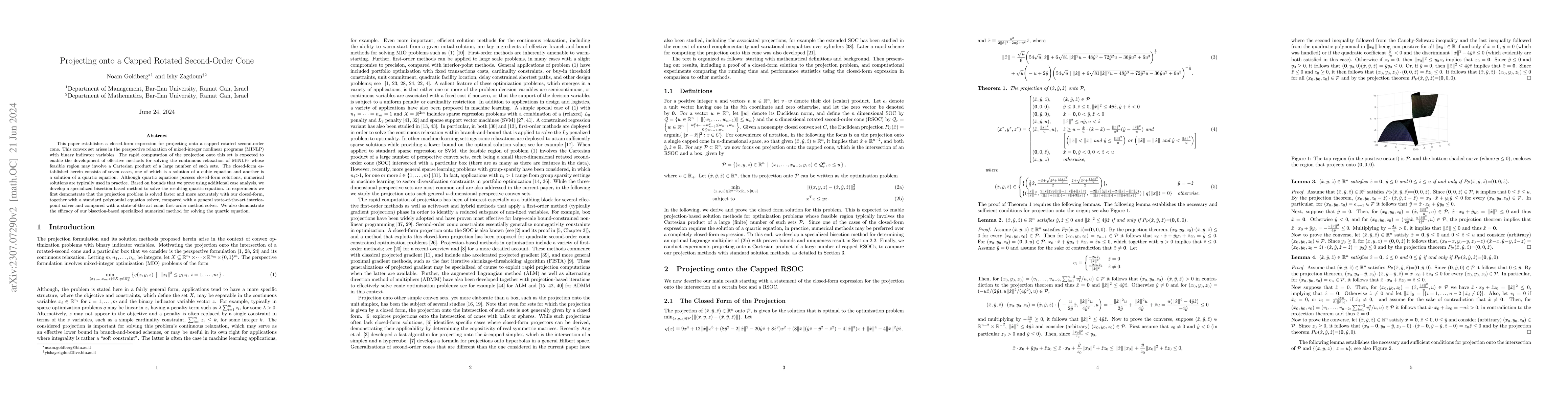 This paper establishes a closed-form expression for projecting onto a capped rotated second-order cone. This convex set arises in the perspective relaxation of mixed-integer nonlinear programs (MINLP) with binary indicator variables. The rapid computation of the projection onto this set is expected to enable the development of effective methods for solving the continuous relaxation of MINLPs whose feasible region may involve a Cartesian product of a large number of such sets. The closed-form established herein consists of seven cases, one of which is a solution of a cubic equation and another is a solution of a quartic equation. Although quartic equations possess closed-form solutions, numerical solutions are typically used in practice. Based on bounds that we prove using additional case analysis, we develop a specialized bisection-based method to solve the resulting quartic equation. In experiments we first demonstrate that the projection problem is solved faster and more accurately with our closed-form, together with a standard polynomial equation solver, compared with a general state-of-the-art interior-point solver and compared with a state-of-the art conic first-order method solver. We also demonstrate the efficacy of our bisection-based specialized numerical method for solving the quartic equation.