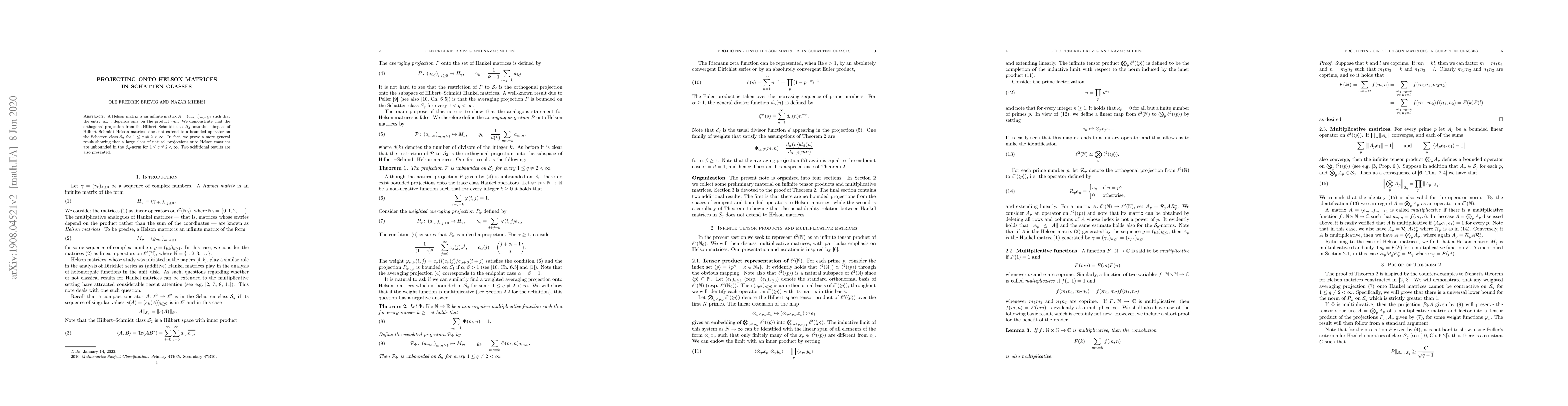 A Helson matrix is an infinite matrix $A = (a_{m,n})_{m,n\geq1}$ such that the entry $a_{m,n}$ depends only on the product $mn$. We demonstrate that the orthogonal projection from the Hilbert--Schmidt class $\mathcal{S}_2$ onto the subspace of Hilbert--Schmidt Helson matrices does not extend to a bounded operator on the Schatten class $\mathcal{S}_q$ for $1 \leq q \neq 2 < \infty$. In fact, we prove a more general result showing that a large class of natural projections onto Helson matrices are unbounded in the $\mathcal{S}_q$-norm for $1 \leq q \neq 2 < \infty$. Two additional results are also presented.