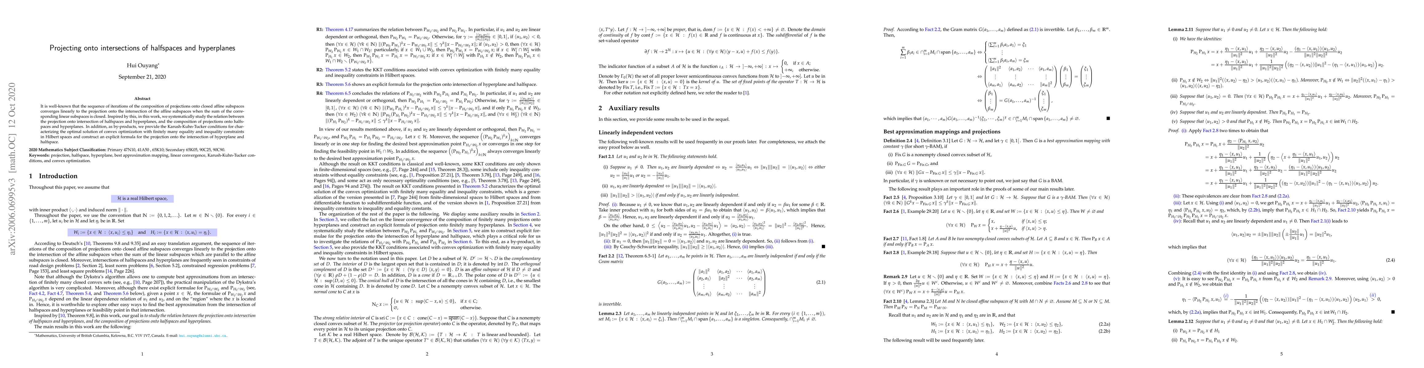 This paper investigates the convergence of iterative projections onto intersections of halfspaces and hyperplanes, proving linear convergence under certain conditions. It also derives the Karush-Kuhn-Tucker conditions for convex optimization and provides an explicit formula for projecting onto the intersection of a hyperplane and a halfspace.