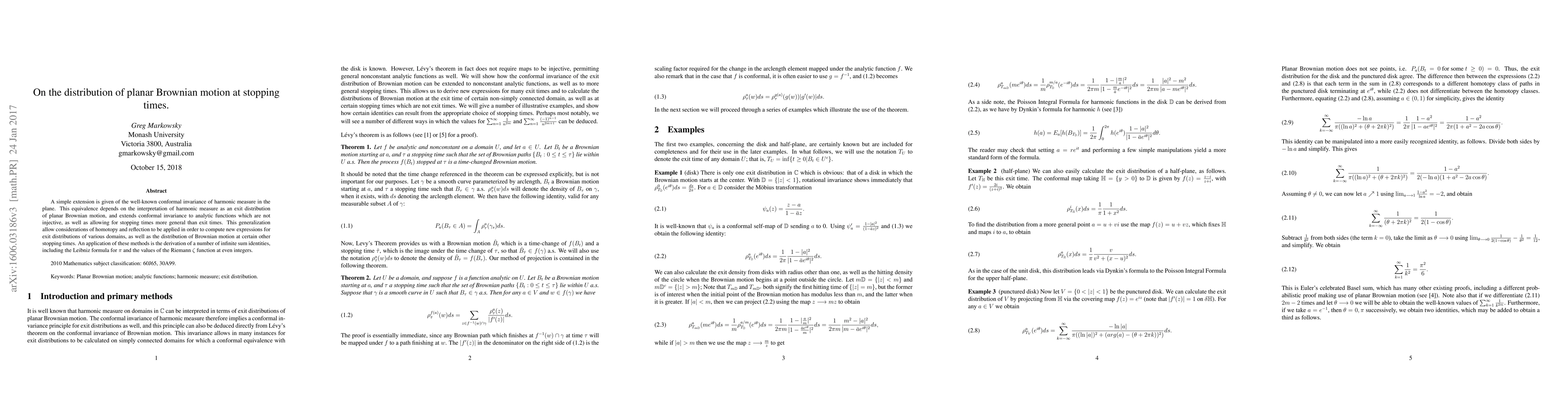This paper introduces a method to analyze planar Brownian motion at stopping times using analytic functions, revealing new insights into exit times and identities like Euler's Basel sum and Leibniz's formula for pi.