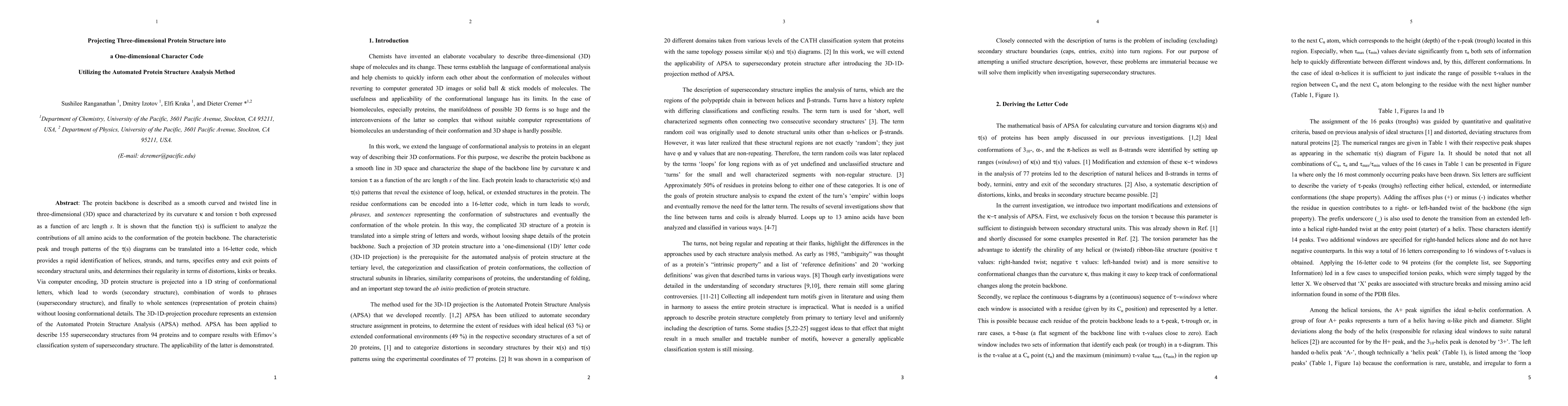This paper presents a method to project 3D protein structures into a 1D character code using torsion angles, which captures the protein's secondary structure features. The 1D string, derived from the Automated Protein Structure Analysis (APSA) method, identifies helices, strands, and turns, and is validated against Efimov's classification system.