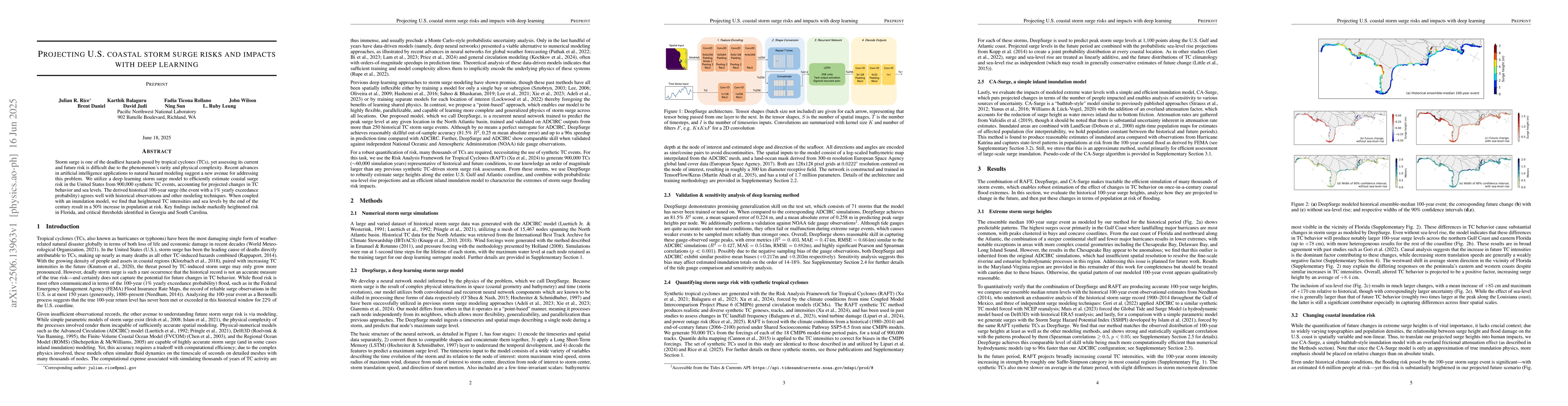 Storm surge is one of the deadliest hazards posed by tropical cyclones (TCs), yet assessing its current and future risk is difficult due to the phenomenon's rarity and physical complexity. Recent advances in artificial intelligence applications to natural hazard modeling suggest a new avenue for addressing this problem. We utilize a deep learning storm surge model to efficiently estimate coastal surge risk in the United States from 900,000 synthetic TC events, accounting for projected changes in TC behavior and sea levels. The derived historical 100-year surge (the event with a 1% yearly exceedance probability) agrees well with historical observations and other modeling techniques. When coupled with an inundation model, we find that heightened TC intensities and sea levels by the end of the century result in a 50% increase in population at risk. Key findings include markedly heightened risk in Florida, and critical thresholds identified in Georgia and South Carolina.