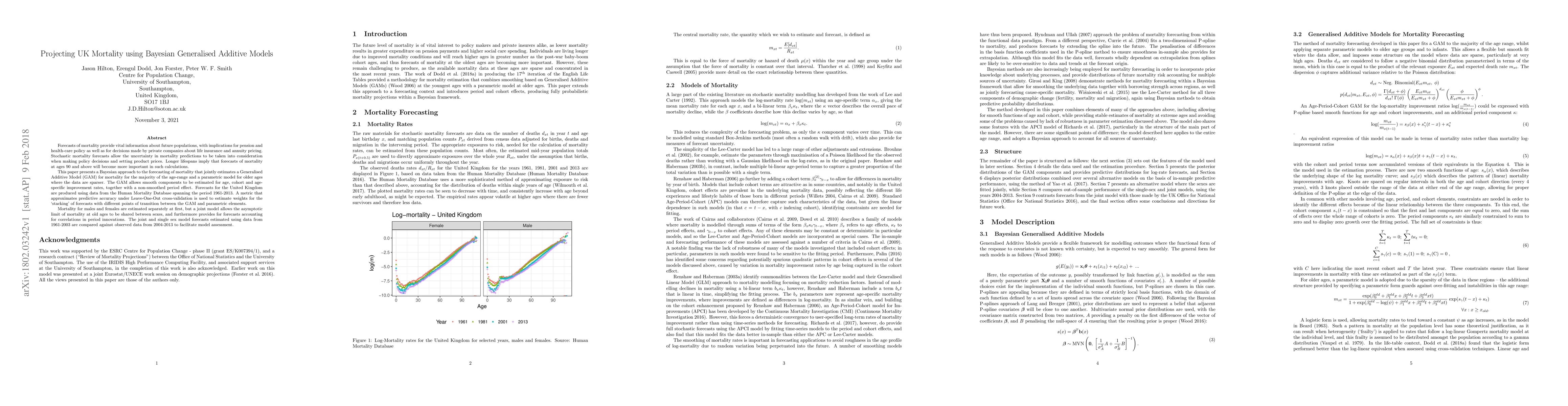 This paper presents a Bayesian approach using Generalised Additive Models (GAM) to forecast UK mortality, incorporating age, cohort, and period effects. The model forecasts separately for males and females, but also jointly to share asymptotic limits and account for period correlations, demonstrating improved predictive accuracy.