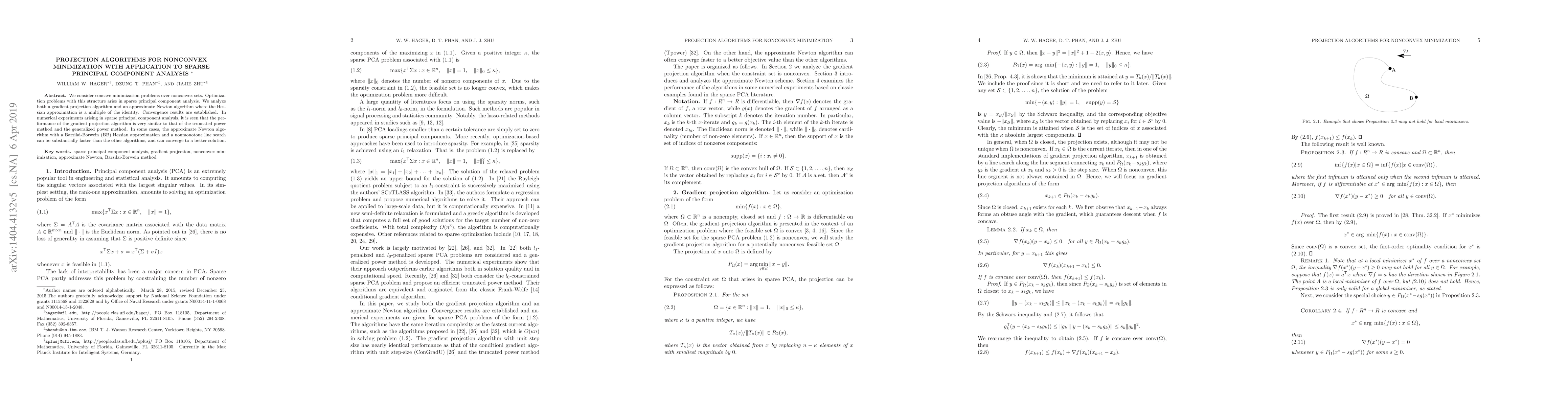 This paper investigates optimization algorithms for non-convex minimization problems, particularly in sparse principal component analysis. It analyzes a gradient projection algorithm and an approximate Newton method, establishing convergence results and demonstrating their effectiveness through numerical experiments.
