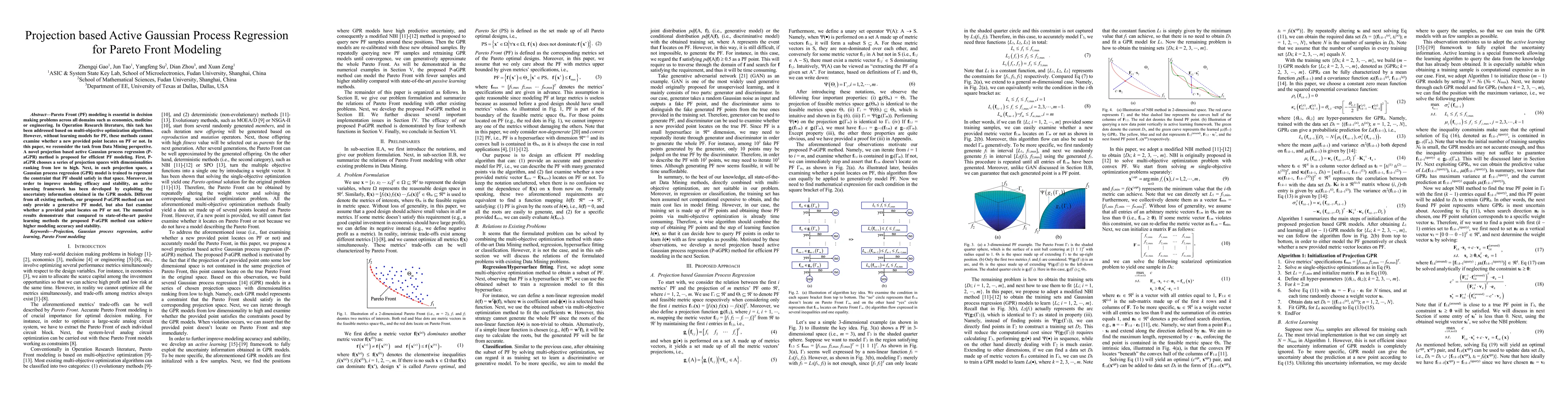 This paper proposes a novel projection based active Gaussian process regression (P-aGPR) method for efficient Pareto Front modeling, enabling both generative PF modeling and fast point location checks. The method trains GPR models in progressively higher dimensional spaces and incorporates active learning to enhance efficacy and stability, outperforming existing passive learning methods in accuracy and stability.