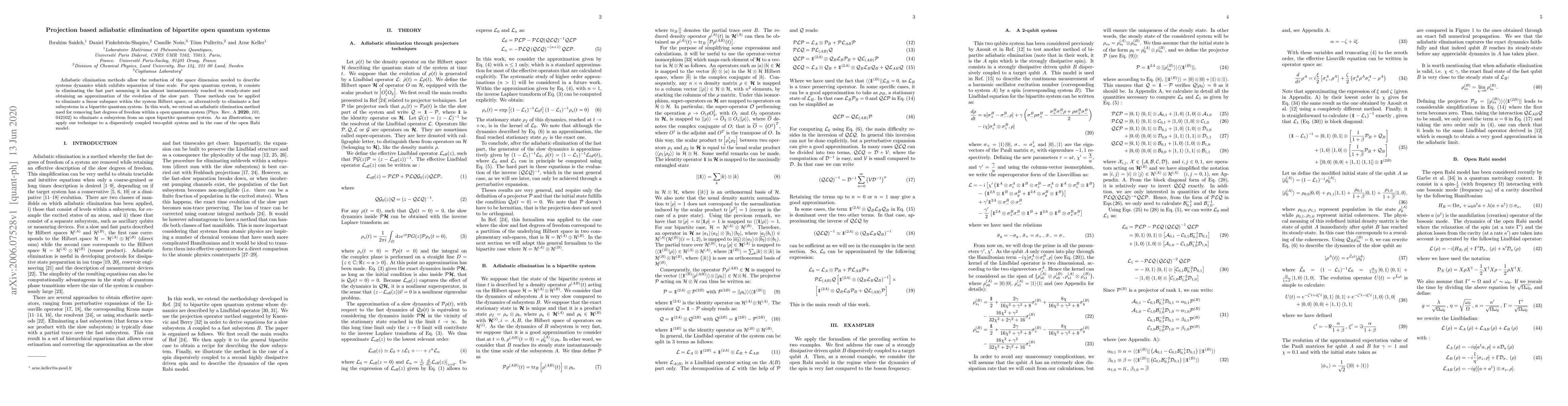This paper extends adiabatic elimination methods to open bipartite quantum systems, specifically eliminating fast subsystems. The technique is demonstrated on a dispersively coupled two-qubit system and the open Rabi model, illustrating the method's effectiveness in simplifying the dynamics of such systems.