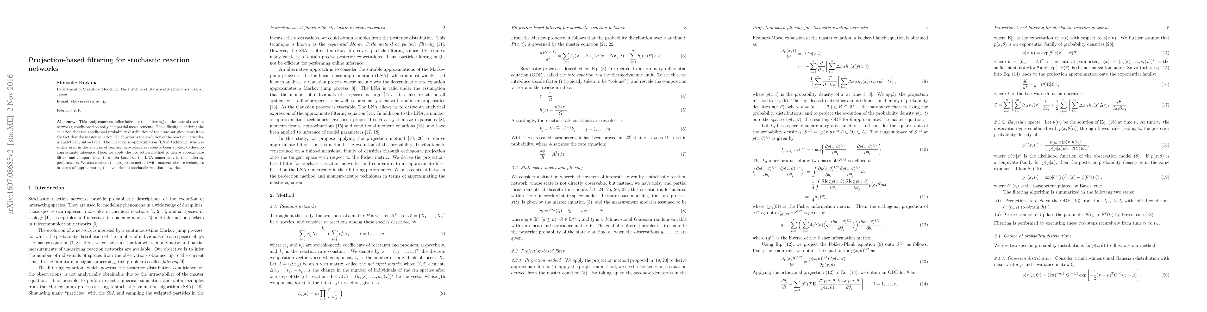 This paper develops projection-based filters for online inference on stochastic reaction networks, comparing their performance to linear noise approximation filters. It contrasts the projection method with moment-closure techniques for approximating the evolution of these networks.