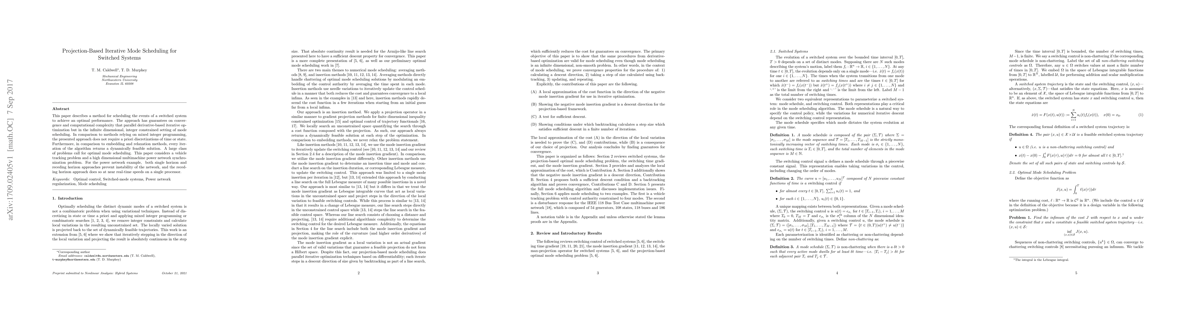This paper proposes a projection-based iterative method for optimal mode scheduling in switched systems, offering convergence guarantees and computational efficiency without requiring time or state discretizations. It demonstrates effectiveness through vehicle tracking and power network synchronization problems, achieving stability at near real-time speeds.