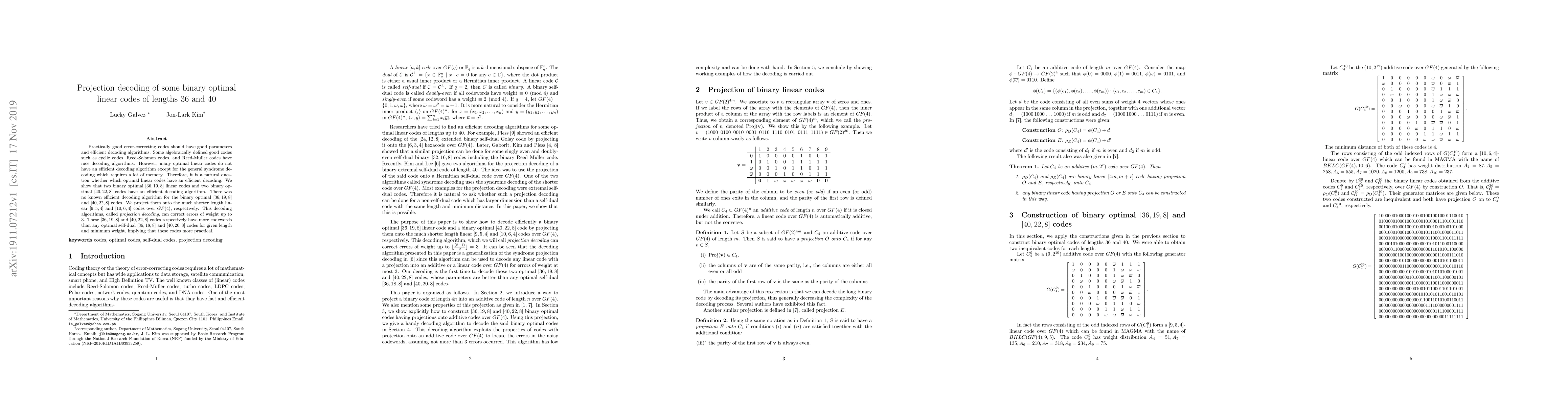 This paper presents an efficient decoding algorithm for two binary optimal linear codes of lengths 36 and 40, previously lacking such methods. The authors employ projection decoding to transform these long codes into shorter, more manageable ones over $GF(4)$, enabling effective error correction.