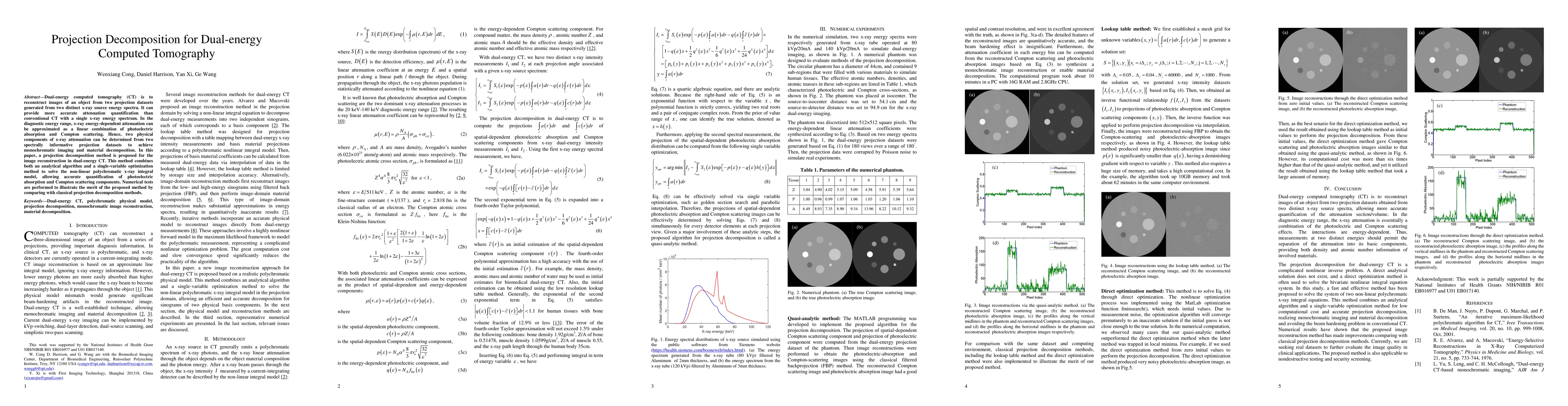 A new projection decomposition method is proposed for dual-energy computed tomography to accurately quantify photoelectric absorption and Compton scattering components from two x-ray energy spectra, enabling monochromatic imaging and material decomposition.