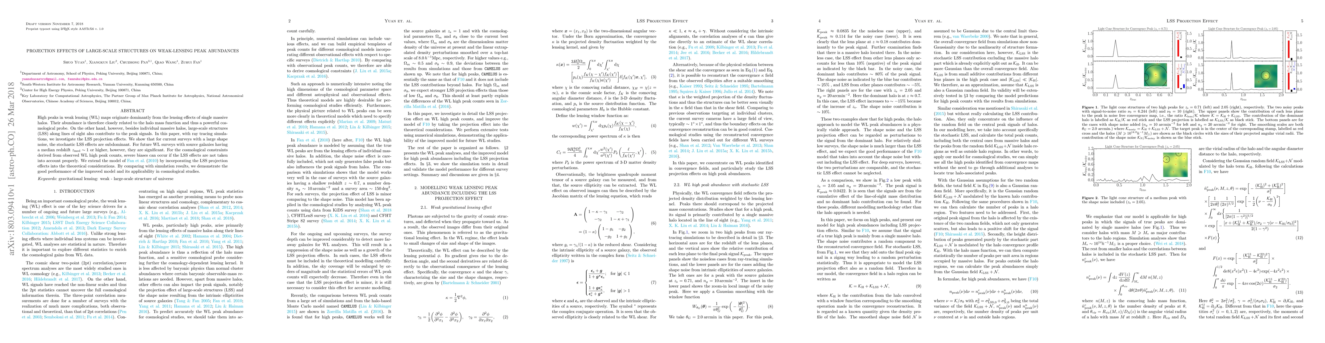 High peaks in weak lensing (WL) maps originate dominantly from the lensing effects of single massive halos. Their abundance is therefore closely related to the halo mass function and thus a powerful cosmological probe. On the other hand, however, besides individual massive halos, large-scale structures (LSS) along lines of sight also contribute to the peak signals. In this paper, with ray tracing simulations, we investigate the LSS projection effects. We show that for current surveys with a large shape noise, the stochastic LSS effects are subdominant. For future WL surveys with source galaxies having a median redshift $z_{\mathrm{med}}\sim1$ or higher, however, they are significant. For the cosmological constraints derived from observed WL high peak counts, severe biases can occur if the LSS effects are not taken into account properly. We extend the model of \citet{Fan2010} by incorporating the LSS projection effects into the theoretical considerations. By comparing with simulation results, we demonstrate the good performance of the improved model and its applicability in cosmological studies.