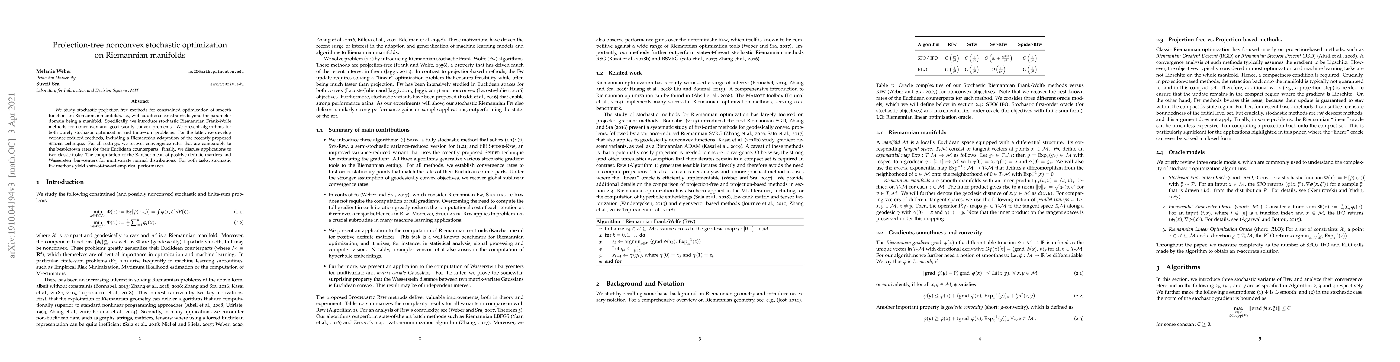 This paper introduces stochastic projection-free methods for optimizing smooth functions on Riemannian manifolds with additional constraints. It presents Riemannian Frank-Wolfe algorithms for nonconvex problems, including variance-reduced techniques for finite-sum problems, achieving convergence rates comparable to Euclidean methods and demonstrating state-of-the-art performance in computing Karcher means and Wasserstein barycenters.