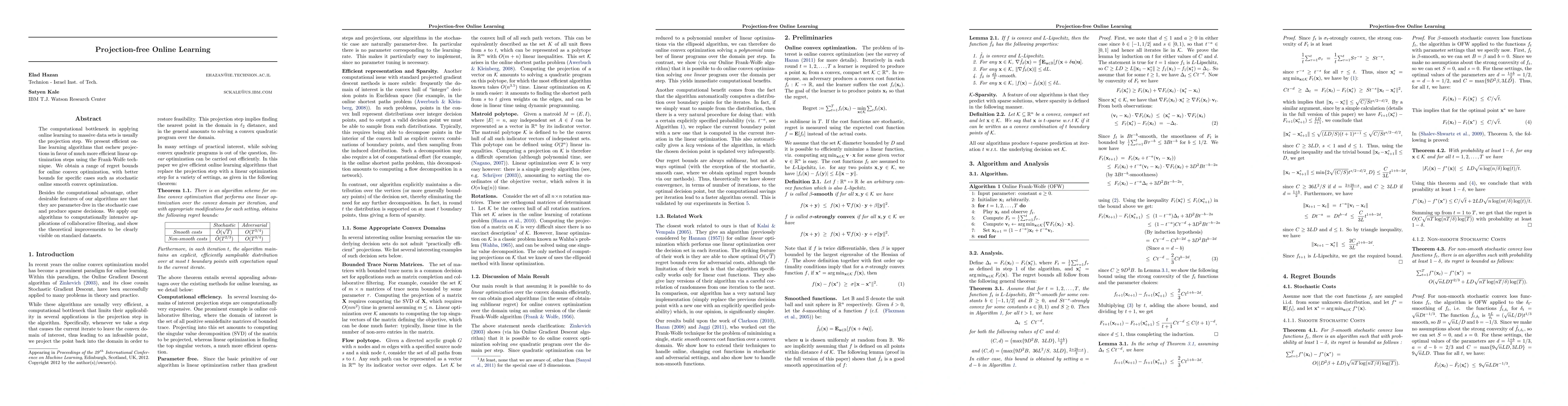 The computational bottleneck in applying online learning to massive data sets is usually the projection step. We present efficient online learning algorithms that eschew projections in favor of much more efficient linear optimization steps using the Frank-Wolfe technique. We obtain a range of regret bounds for online convex optimization, with better bounds for specific cases such as stochastic online smooth convex optimization. Besides the computational advantage, other desirable features of our algorithms are that they are parameter-free in the stochastic case and produce sparse decisions. We apply our algorithms to computationally intensive applications of collaborative filtering, and show the theoretical improvements to be clearly visible on standard datasets.