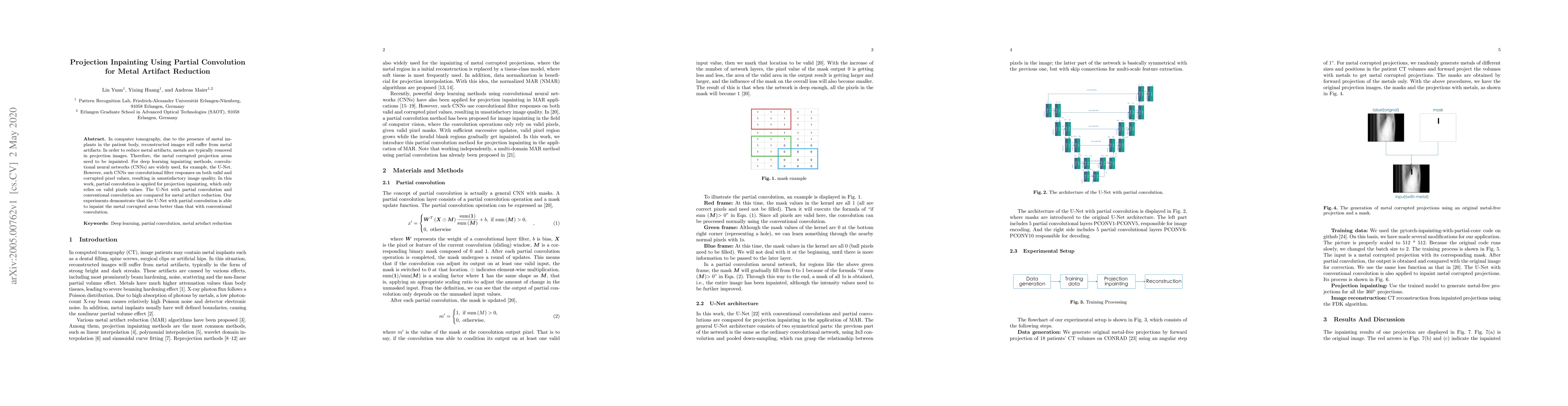 This paper proposes a method using partial convolution in a U-Net architecture for inpainting metal artifact-corrupted projection images in computer tomography. Compared to conventional CNNs, partial convolution only uses valid pixel values, leading to better metal artifact reduction and improved image quality.