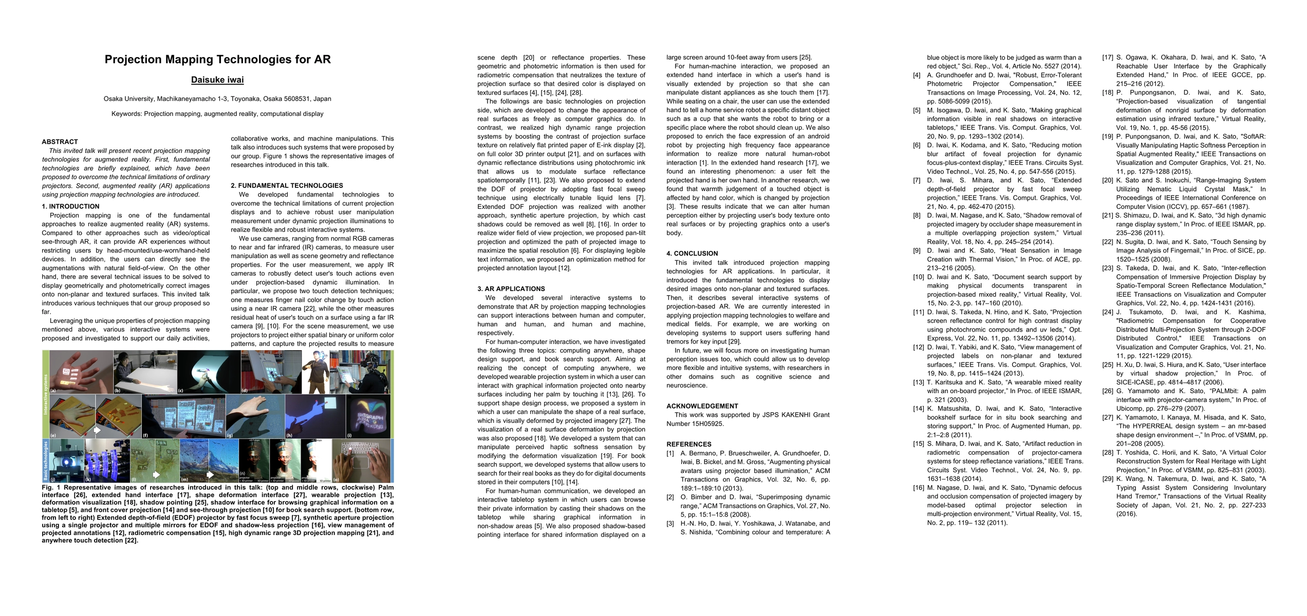 This invited talk will present recent projection mapping technologies for augmented reality. First, fundamental technologies are briefly explained, which have been proposed to overcome the technical limitations of ordinary projectors. Second, augmented reality (AR) applications using projection mapping technologies are introduced.