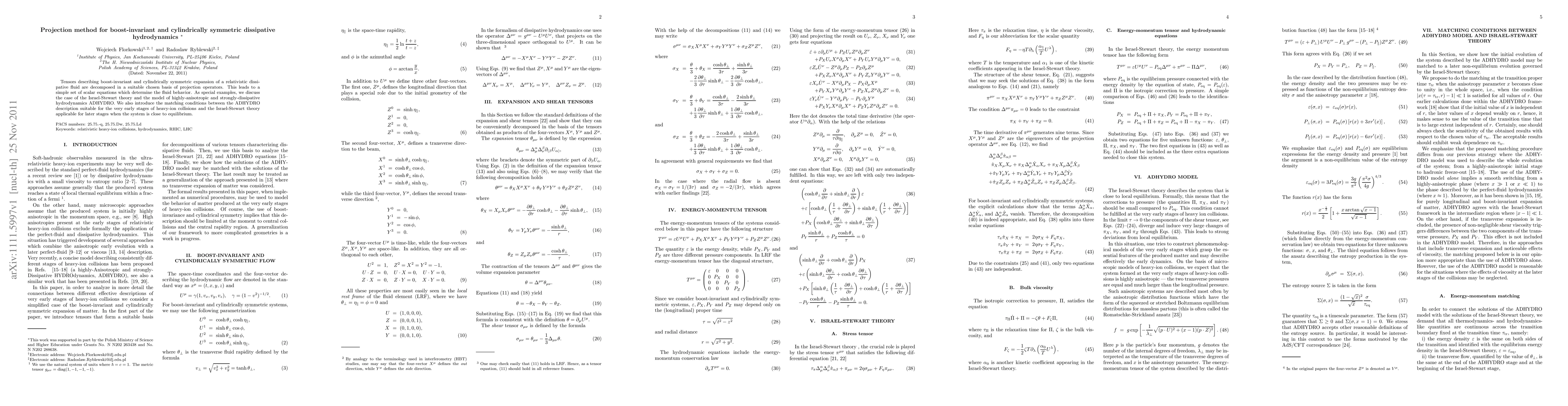 Tensors describing boost-invariant and cylindrically symmetric expansion of a relativistic dissipative fluid are decomposed in a suitable chosen basis of projection operators. This leads to a simple set of scalar equations which determine the fluid behavior. As special examples, we discuss the case of the Israel-Stewart theory and the model of highly-anisotropic and strongly-dissipative hydrodynamics ADHYDRO. We also introduce the matching conditions between the ADHYDRO description suitable for the very early stages of heavy-ion collisions and the Israel-Stewart theory applicable for later stages when the system is close to equilibrium.