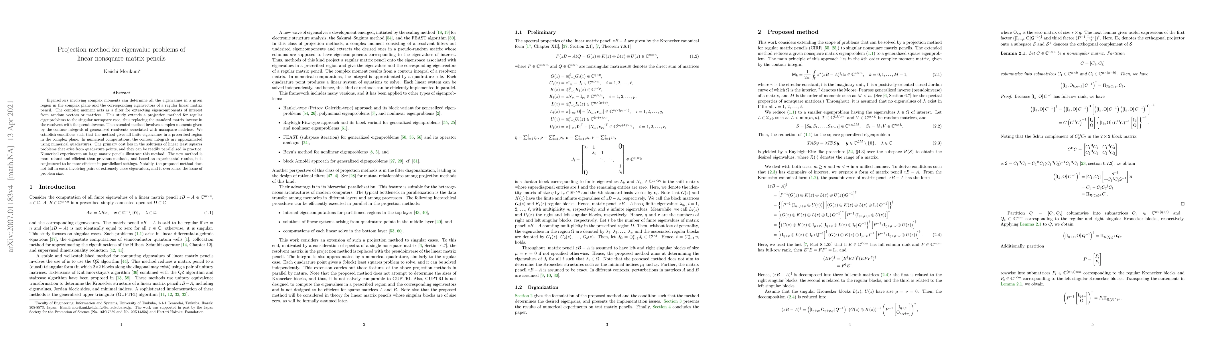 Eigensolvers involving complex moments can determine all the eigenvalues in a given region in the complex plane and the corresponding eigenvectors of a regular linear matrix pencil. The complex moment acts as a filter for extracting eigencomponents of interest from random vectors or matrices. This study extends a projection method for regular eigenproblems to the singular nonsquare case, thus replacing the standard matrix inverse in the resolvent with the pseudoinverse. The extended method involves complex moments given by the contour integrals of generalized resolvents associated with nonsquare matrices. We establish conditions such that the method gives all finite eigenvalues in a prescribed region in the complex plane. In numerical computations, the contour integrals are approximated using numerical quadratures. The primary cost lies in the solutions of linear least squares problems that arise from quadrature points, and they can be readily parallelized in practice. Numerical experiments on large matrix pencils illustrate this method. The new method is more robust and efficient than previous methods, and based on experimental results, it is conjectured to be more efficient in parallelized settings. Notably, the proposed method does not fail in cases involving pairs of extremely close eigenvalues, and it overcomes the issue of problem size.
