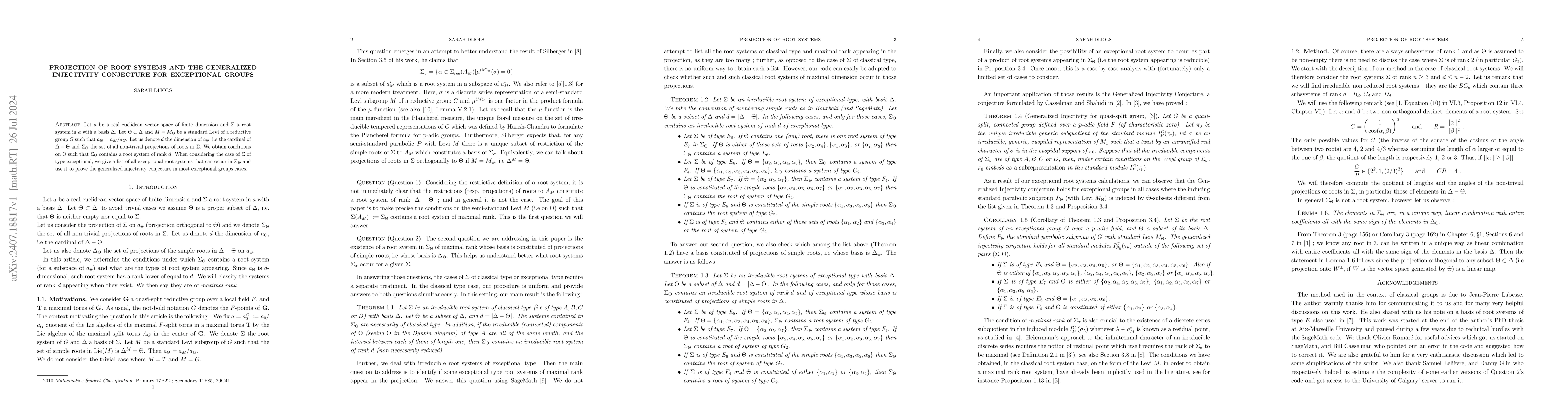 Let $a$ be a real euclidean vector space of finite dimension and $\Sigma$ a root system in $a$ with a basis $\Delta$. Let $\Theta \subset \Delta$ and $M = M_{\Theta}$ be a standard Levi of a reductive group $G$ such that $a_{\Theta}$ $= a_M / a_G$. Let us denote $d$ the dimension of $a_{\Theta}$, i.e the cardinal of $\Delta - \Theta$ and $\Sigma_{\Theta}$ the set of all non-trivial projections of roots in $\Sigma$. We obtain conditions on $\Theta$ such that $\Sigma_{\Theta}$ contains a root system of rank $d$. When considering the case of $\Sigma$ of type exceptional, we give a list of all exceptional root systems that can occur in $\Sigma_\Theta$ and use it to prove the generalized injectivity conjecture in most exceptional groups cases.