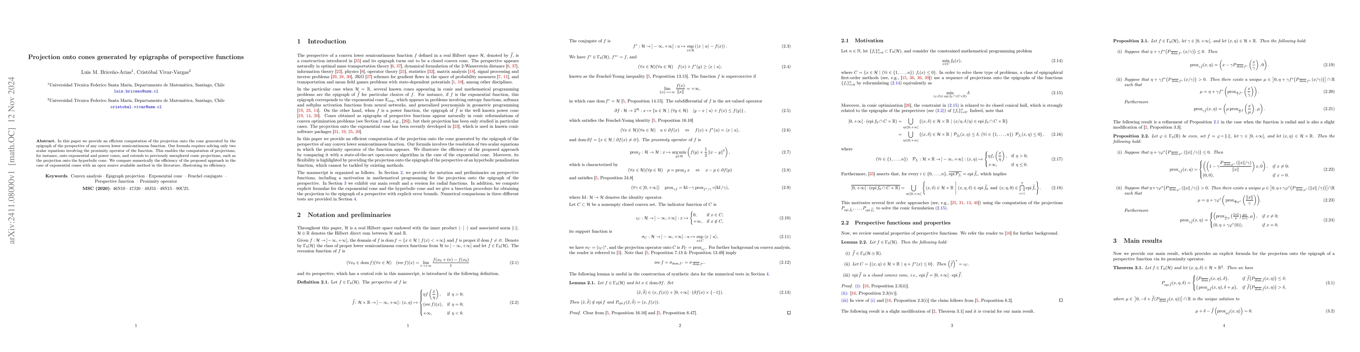 This paper proposes an efficient method to compute projections onto cones generated by epigraphs of perspective functions, requiring only two scalar equations involving the proximity operator. It extends to previously unexplored conic projections, including the hyperbolic cone, and demonstrates efficiency compared to existing methods for exponential cones.