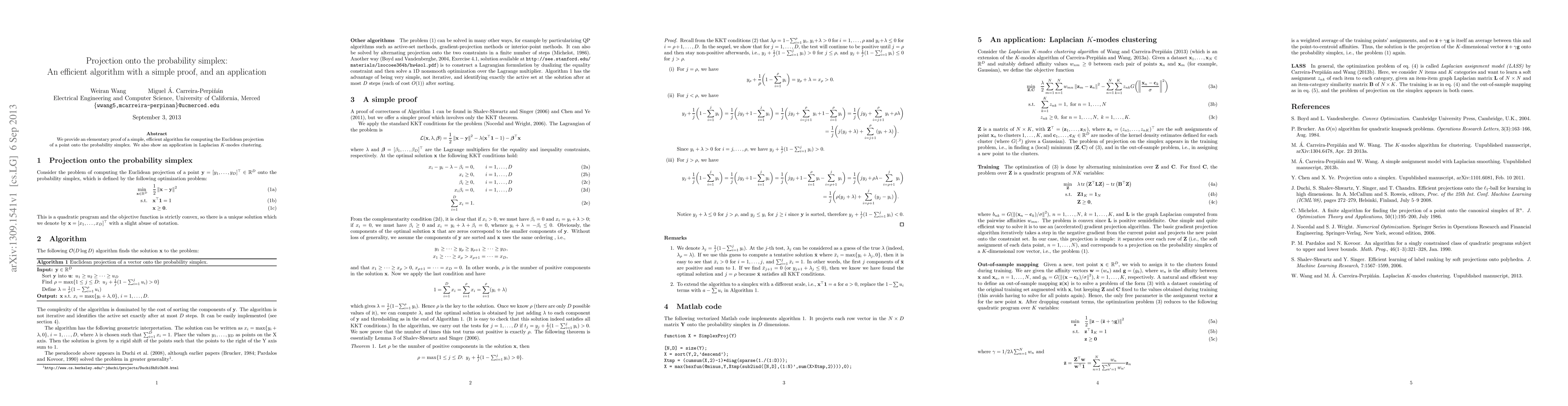 We provide an elementary proof of a simple, efficient algorithm for computing the Euclidean projection of a point onto the probability simplex. We also show an application in Laplacian K-modes clustering.