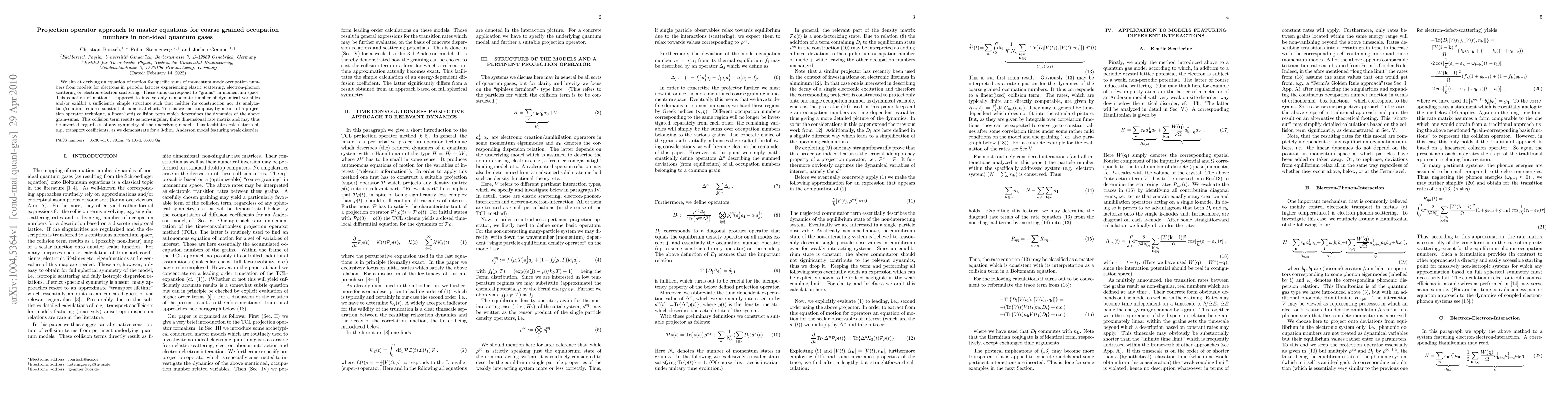 We aim at deriving an equation of motion for specific sums of momentum mode occupation numbers from models for electrons in periodic lattices experiencing elastic scattering, electron-phonon scattering or electron-electron scattering. These sums correspond to "grains" in momentum space. This equation of motion is supposed to involve only a moderate number of dynamical variables and/or exhibit a sufficiently simple structure such that neither its construction nor its analyzation/solution requires substantial numerical effort. To this we end compute, by means of a projection operator technique, a linear(ized) collision term which determines the dynamics of the above grain-sums. This collision term results as non-singular, finite dimensional rate matrix and may thus be inverted regardless of any symmetry of the underlying model. This facilitates calculations of, e.g., transport coefficients, as we demonstrate for a 3-dim. Anderson model featuring weak disorder.