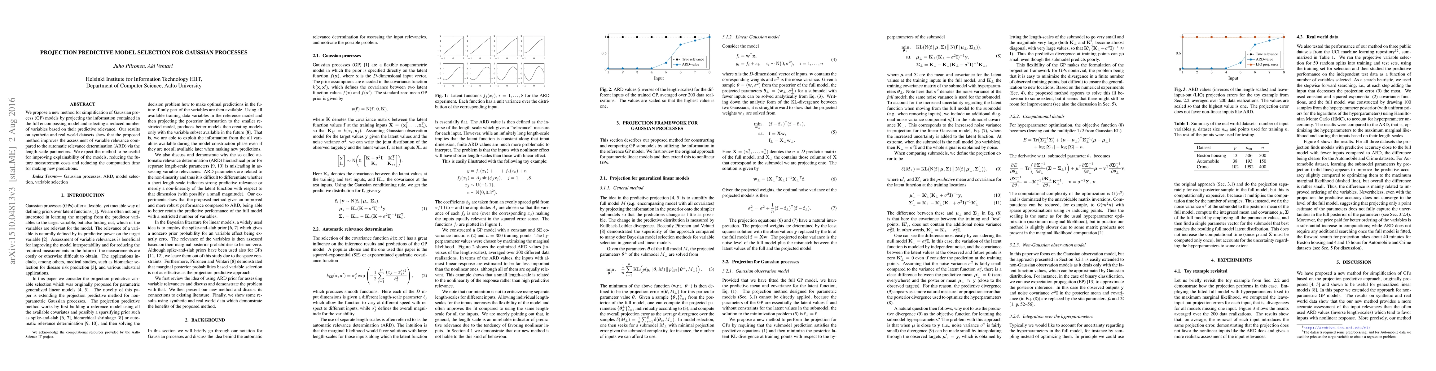 This paper introduces a new method to simplify Gaussian process models by projecting and selecting a subset of variables based on predictive relevance, improving variable relevance assessment over automatic relevance determination. The method enhances model explainability, reduces future measurement costs, and lowers computation time for new predictions.