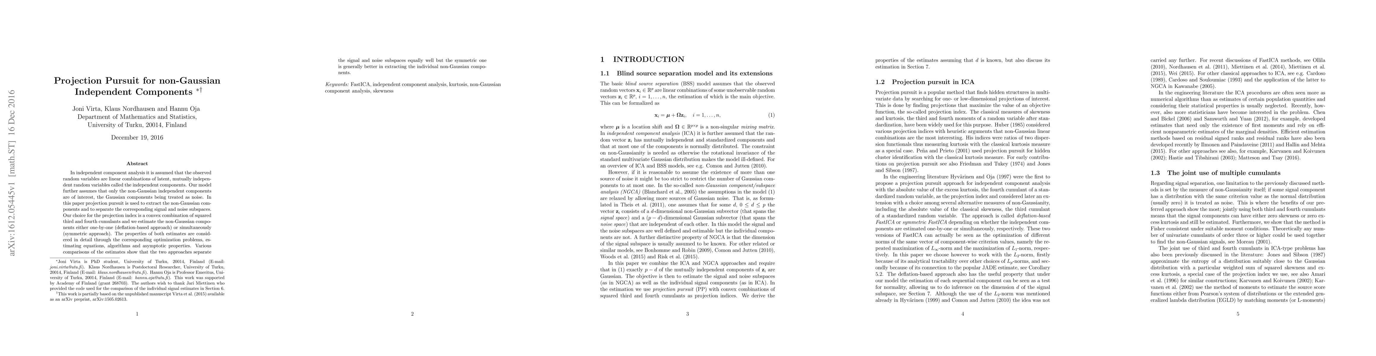 This paper explores the use of projection pursuit to extract non-Gaussian independent components from a mixture, treating Gaussian components as noise. It compares deflation-based and symmetric approaches, finding both effective in separating signal and noise but the symmetric approach better for individual component extraction.