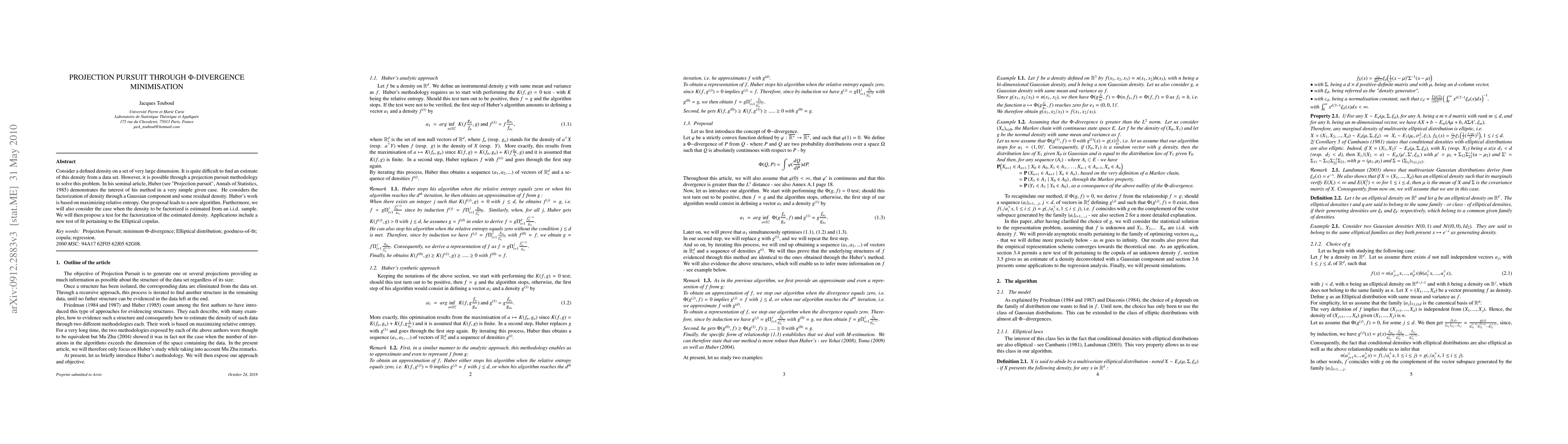 Consider a defined density on a set of very large dimension. It is quite difficult to find an estimate of this density from a data set. However, it is possible through a projection pursuit methodology to solve this problem. Touboul's article "Projection Pursuit Through Relative Entropy Minimization", 2009, demonstrates the interest of the author's method in a very simple given case. He considers the factorization of a density through an Elliptical component and some residual density. The above Touboul's work is based on minimizing relative entropy. In the present article, our proposal will aim at extending this very methodology to the $\Phi-$divergence. Furthermore, we will also consider the case when the density to be factorized is estimated from an i.i.d. sample. We will then propose a test for the factorization of the estimated density. Applications include a new test of fit pertaining to the Elliptical copulas.