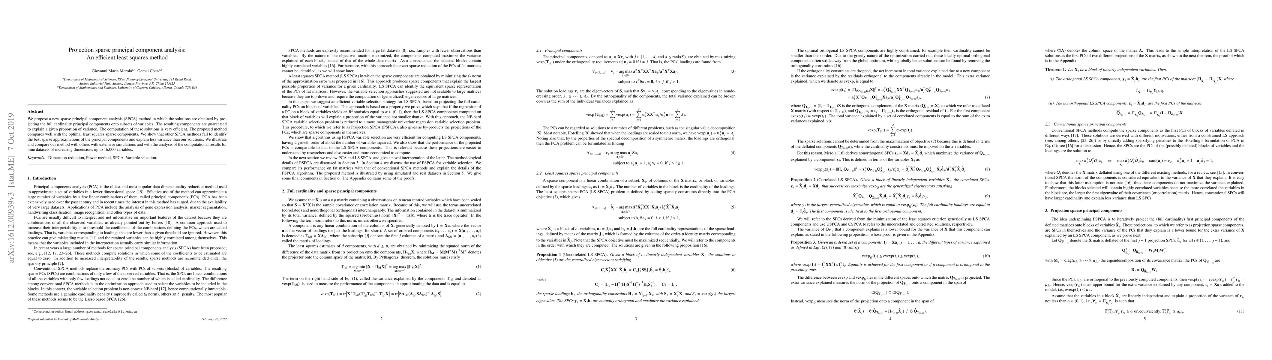This paper introduces a new efficient sparse principal component analysis (SPCA) method that projects full cardinality principal components onto variable subsets, ensuring they explain a specified proportion of variance. The proposed method outperforms existing SPCA techniques in identifying optimal sparse approximations and explaining more variance, as demonstrated through real socioeconomic data and computational results on nine datasets.