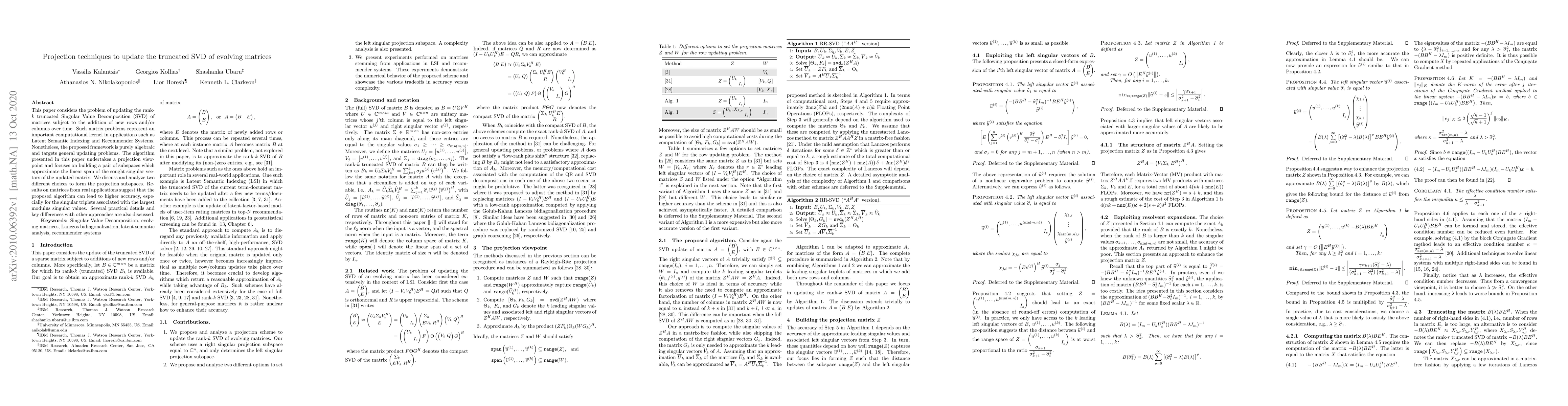 This paper proposes an algebraic algorithm for updating the truncated SVD of evolving matrices by constructing projection subspaces to approximate the singular vectors. The method achieves higher accuracy for significant singular values, as demonstrated by real-world applications, and contrasts with other updating techniques.
