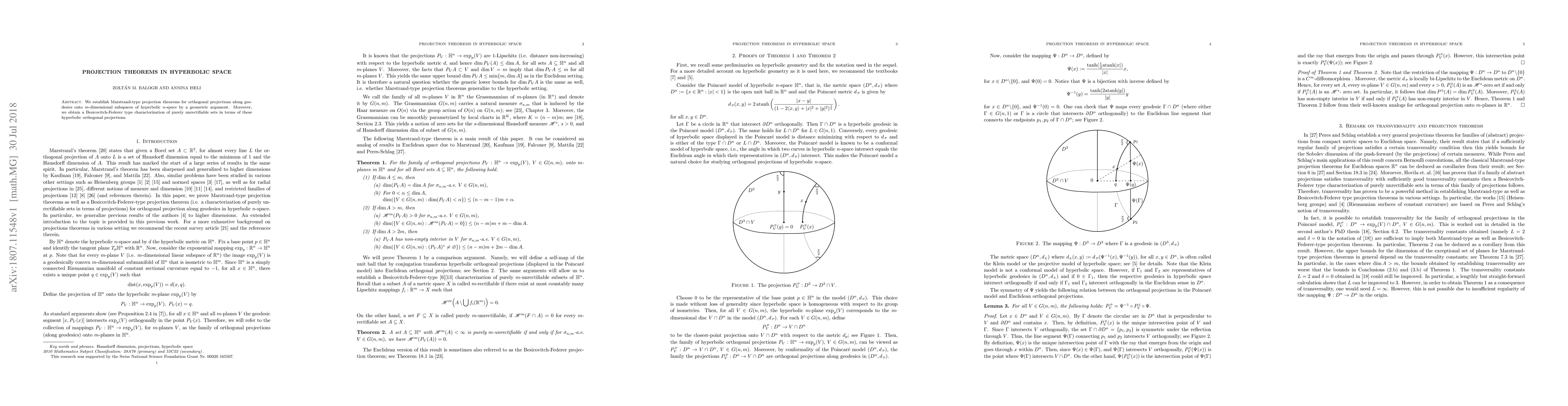 The research establishes Marstrand-type projection theorems in hyperbolic space using a geometric argument, obtaining a Besicovitch-Federer type characterization of purely unrectifiable sets through hyperbolic orthogonal projections.