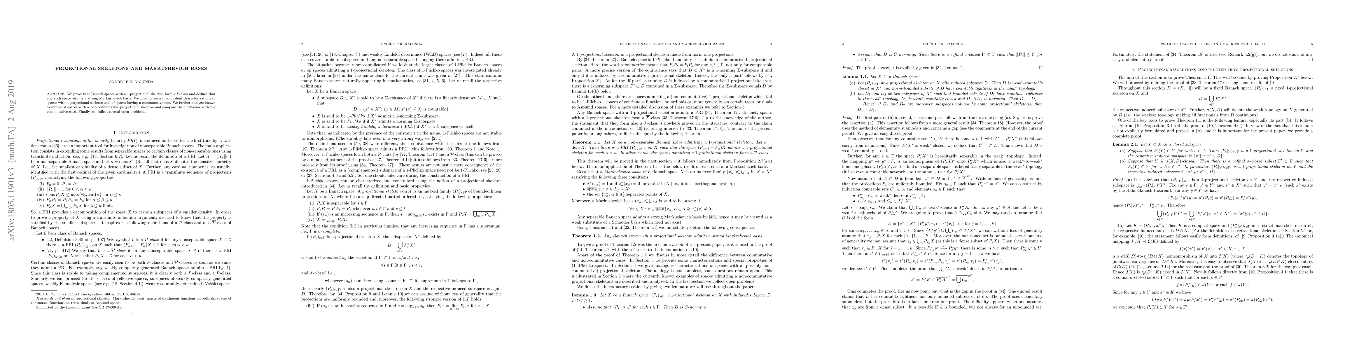We prove that Banach spaces with a $1$-projectional skeleton form a $\mathcal{P}$-class and deduce that any such space admits a strong Markushevich basis. We provide several equivalent characterizations of spaces with a projectional skeleton and of spaces having a commutative one. We further analyze known examples of spaces with a non-commutative projectional skeleton and compare their behavior with the commutative case. Finally, we collect several open problems.